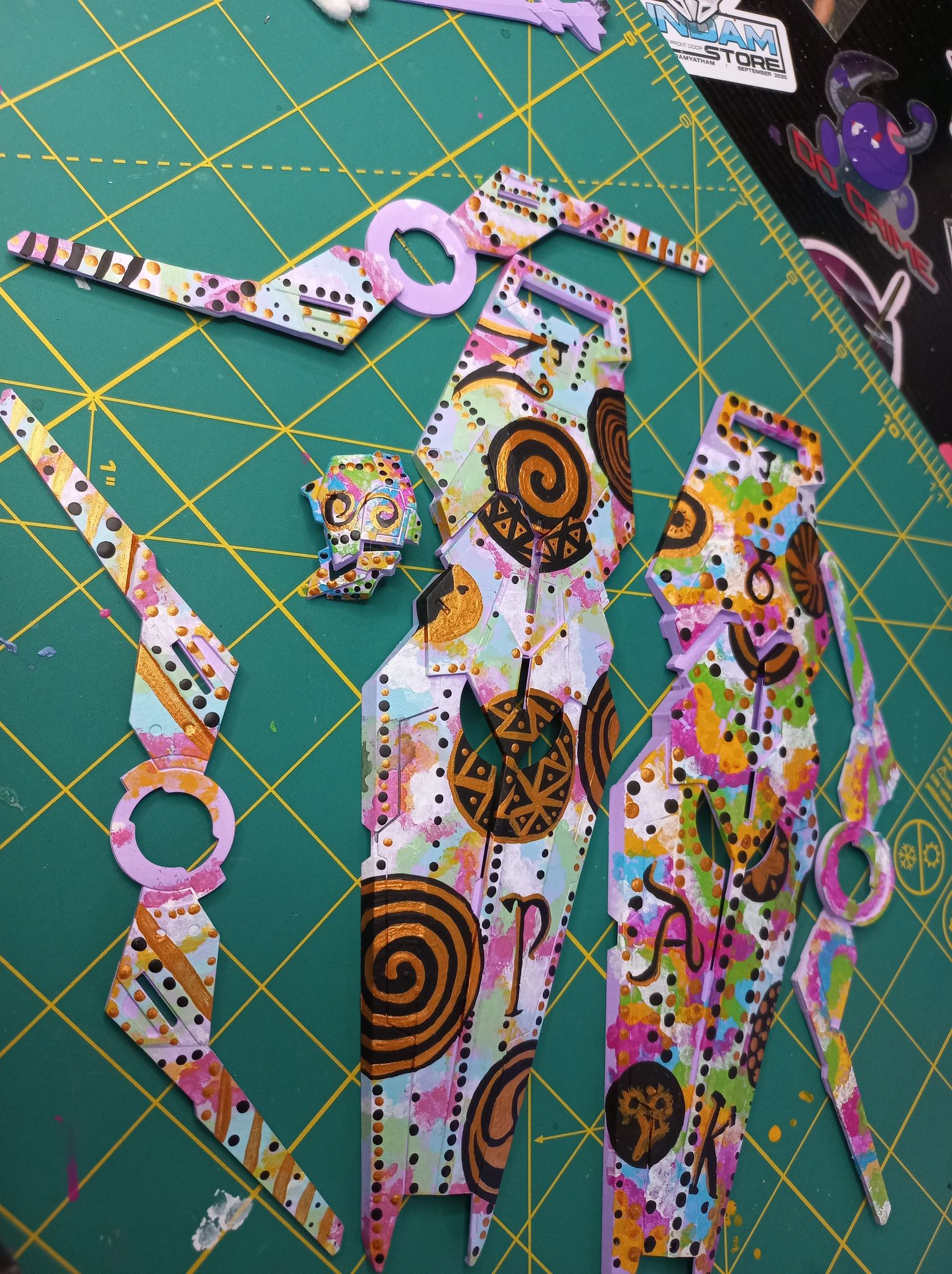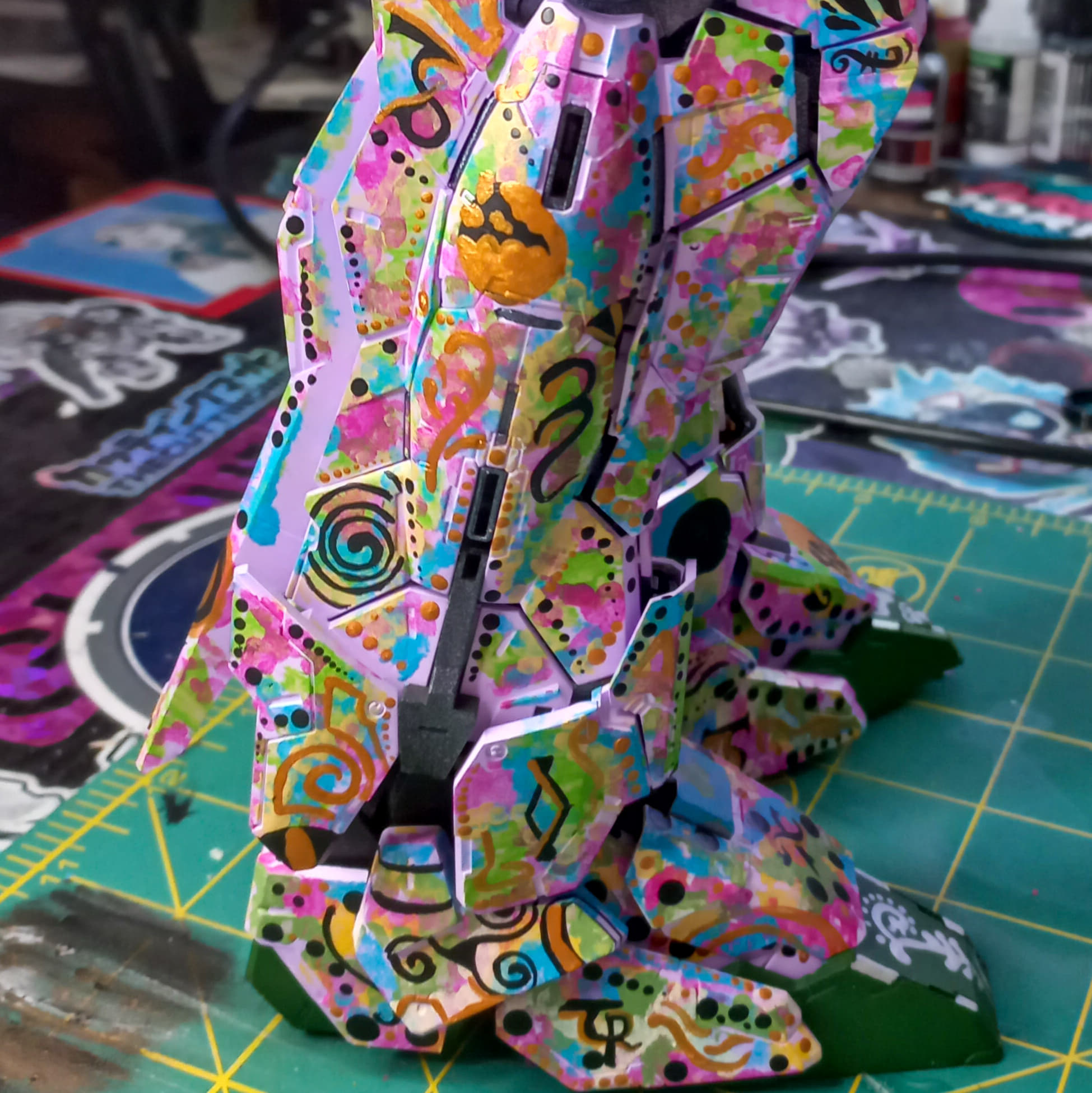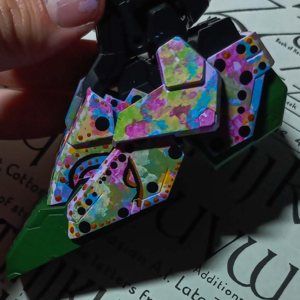 The purple base layer was airbrushed on with Vallejo’s mecha purple on a white primer coat. The Vallejo green, blue, pink, yellow, and while were stippled on with tips. The copper and black details were hand-painted. I used dotting tools to make the dotted details. The clear parts are spray painted gold and bronze on a black primer. This theme will carry out most of the build.