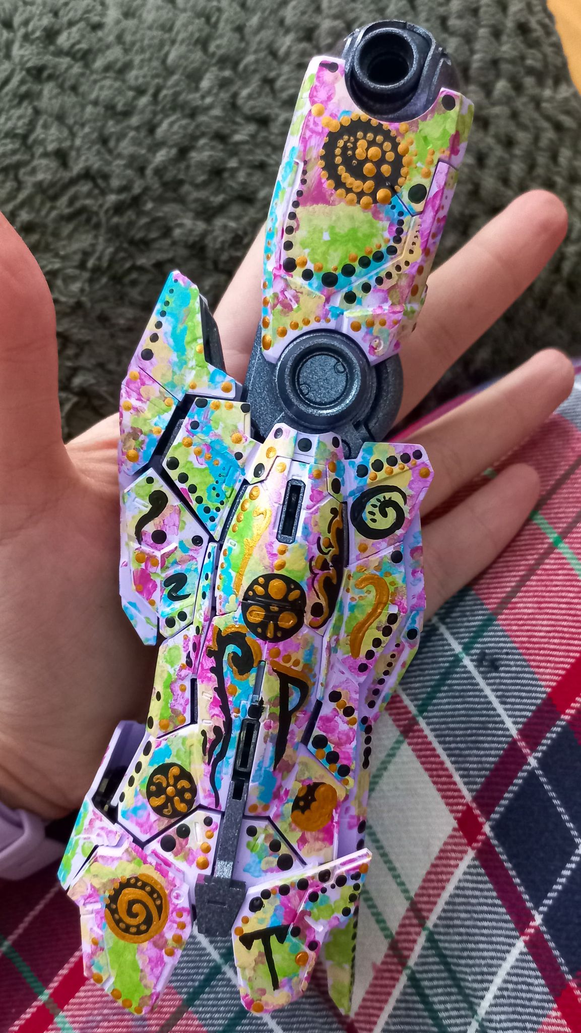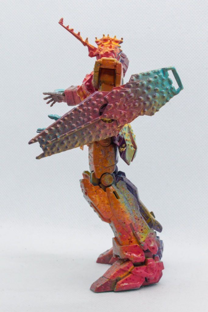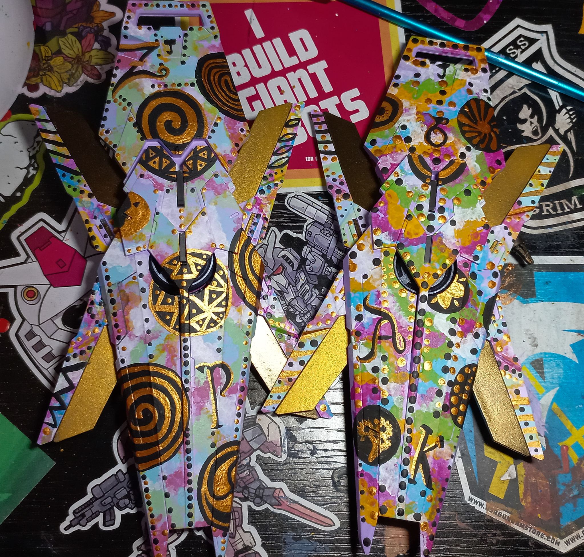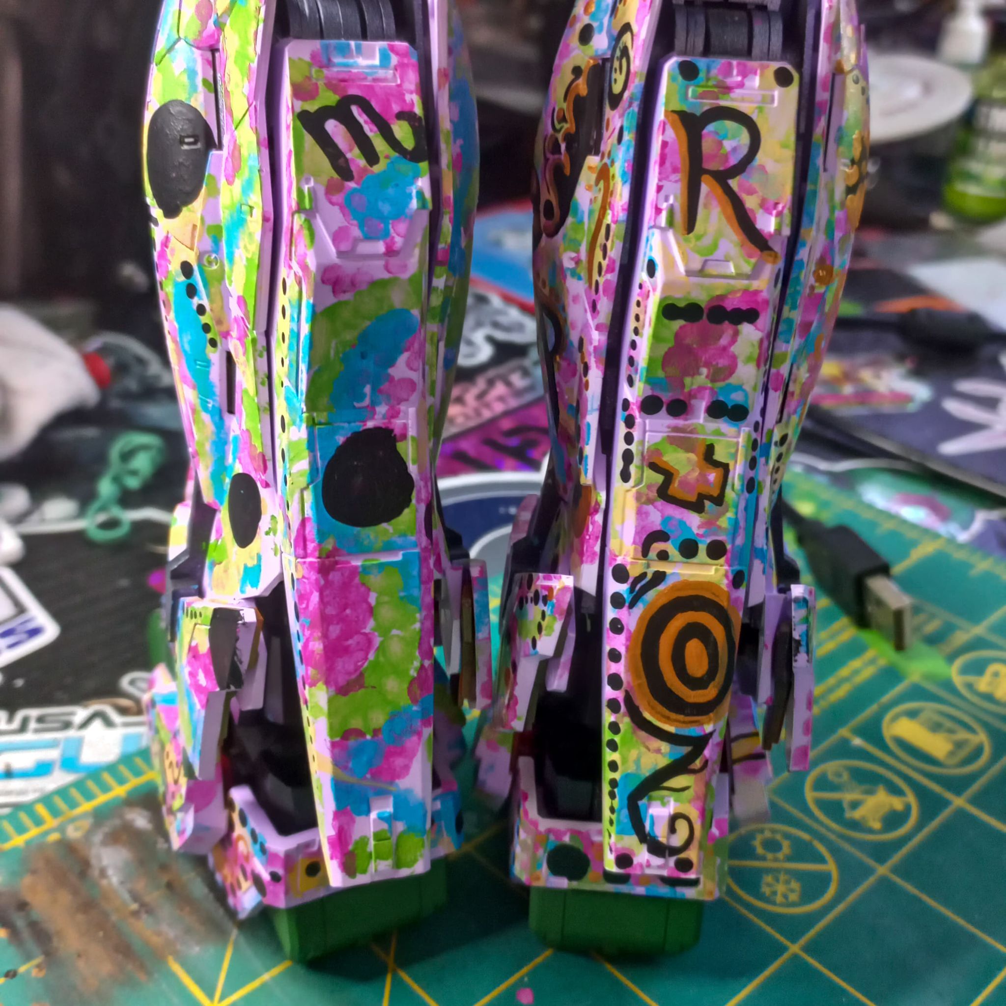 The purple base layer was airbrushed on with Vallejo’s mecha purple on a white primer coat. The Vallejo green, blue, pink, yellow, and while were stippled on with tips. The copper and black details were hand-painted. I used dotting tools to make the dotted details. The clear parts are spray painted gold and bronze on a black primer. This theme will carry out most of the build.