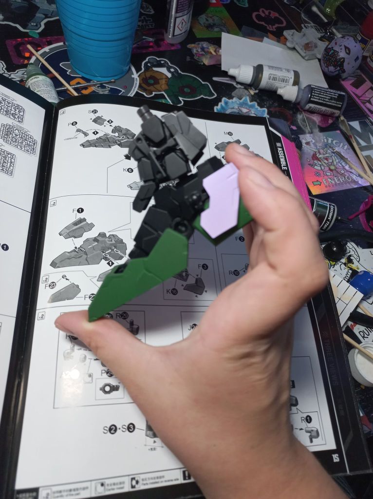 Next came the feet. For the dark blue plastic parts, I painted a nice shade of green on a black primer.