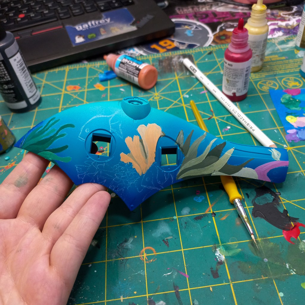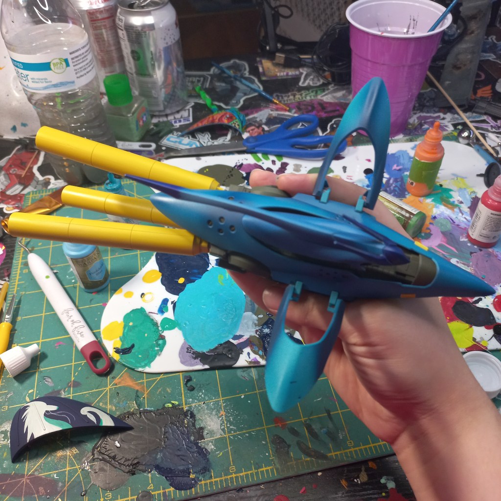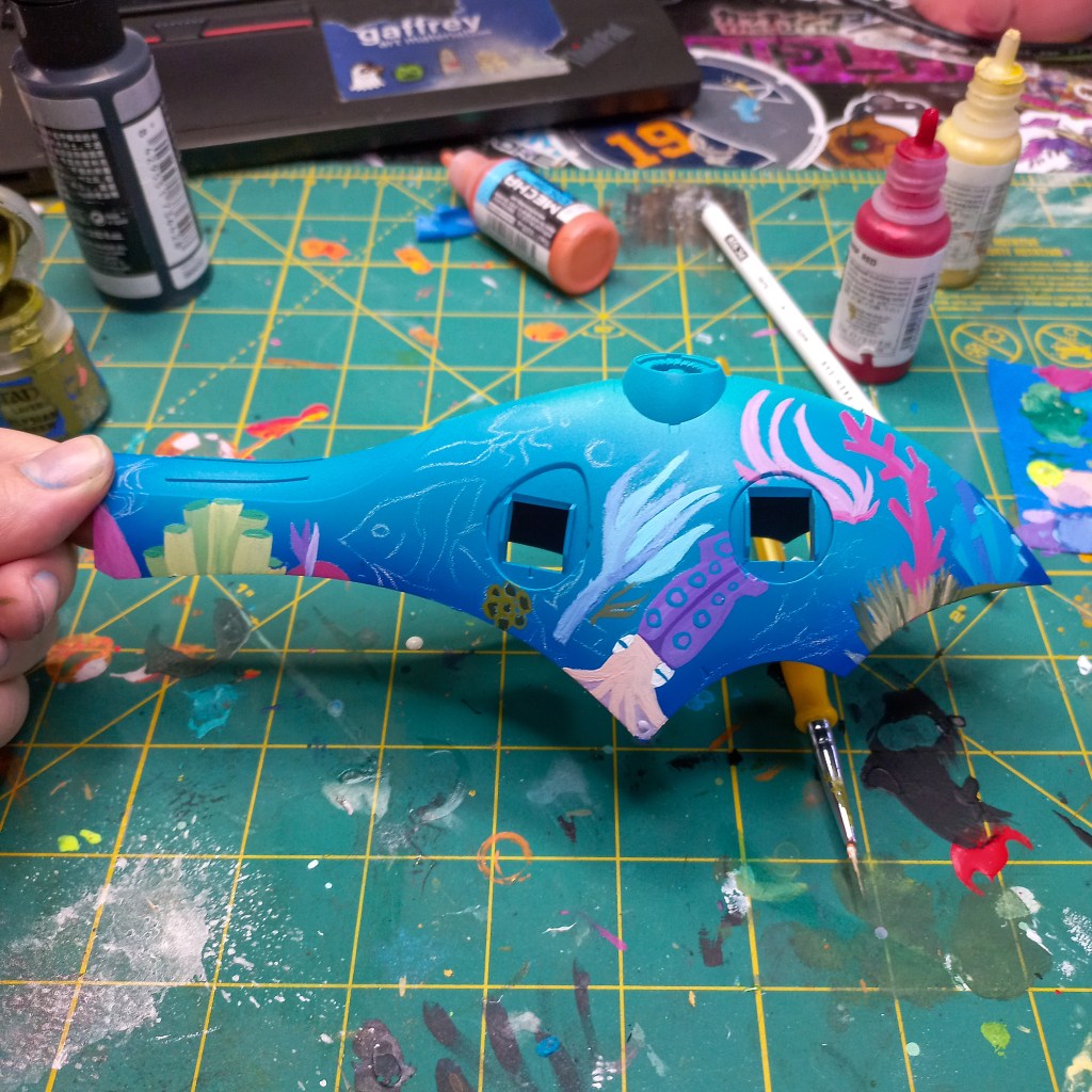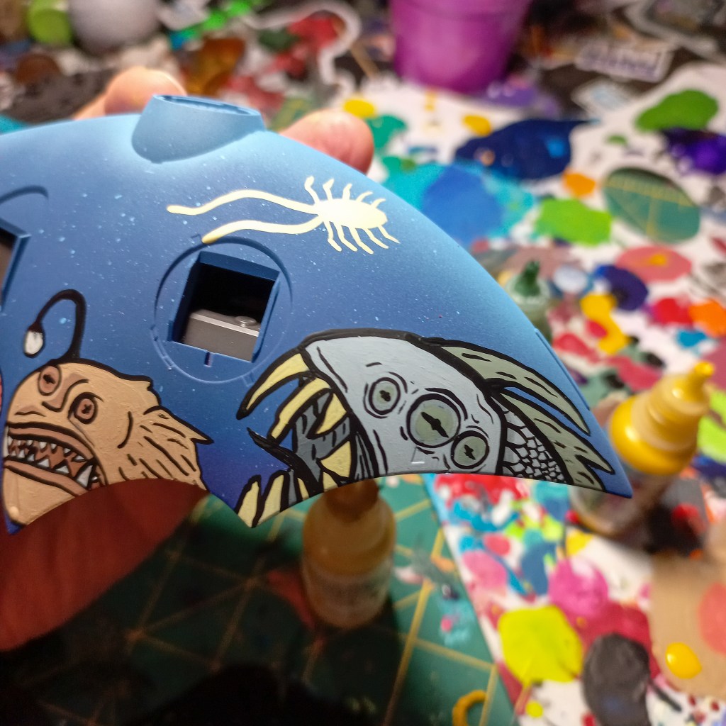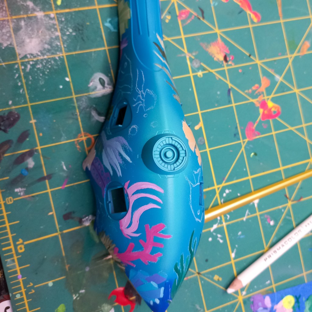 I painted sea ray creatures on it. The funnels are a bright yellow (as a contrast color) and the thrusters are a base black. I chose a flat olive drab for the inner frame. It felt the best choice to compliment the blues.