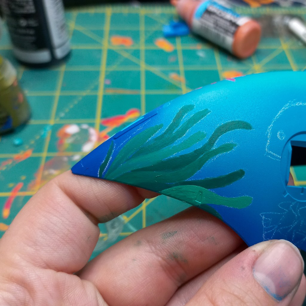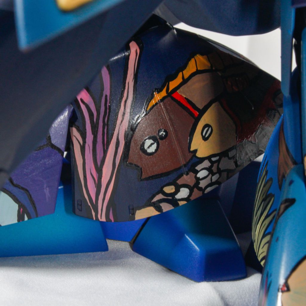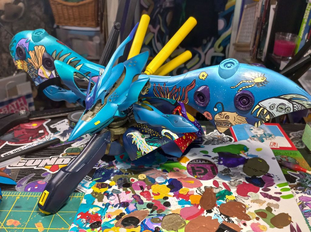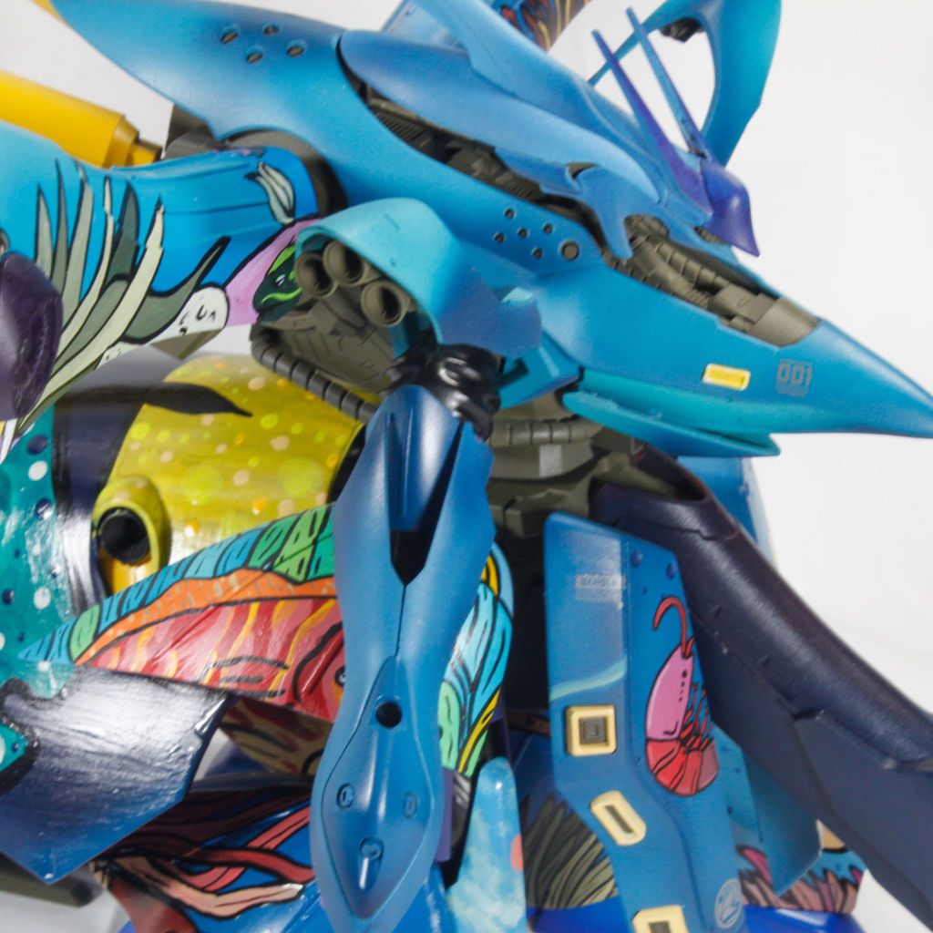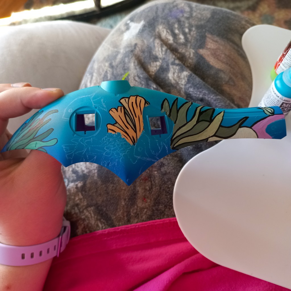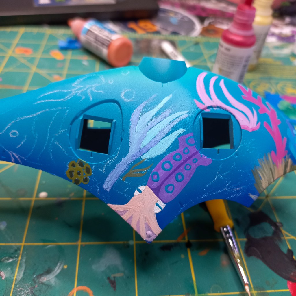 I painted sea ray creatures on it. The funnels are a bright yellow (as a contrast color) and the thrusters are a base black. I chose a flat olive drab for the inner frame. It felt the best choice to compliment the blues.