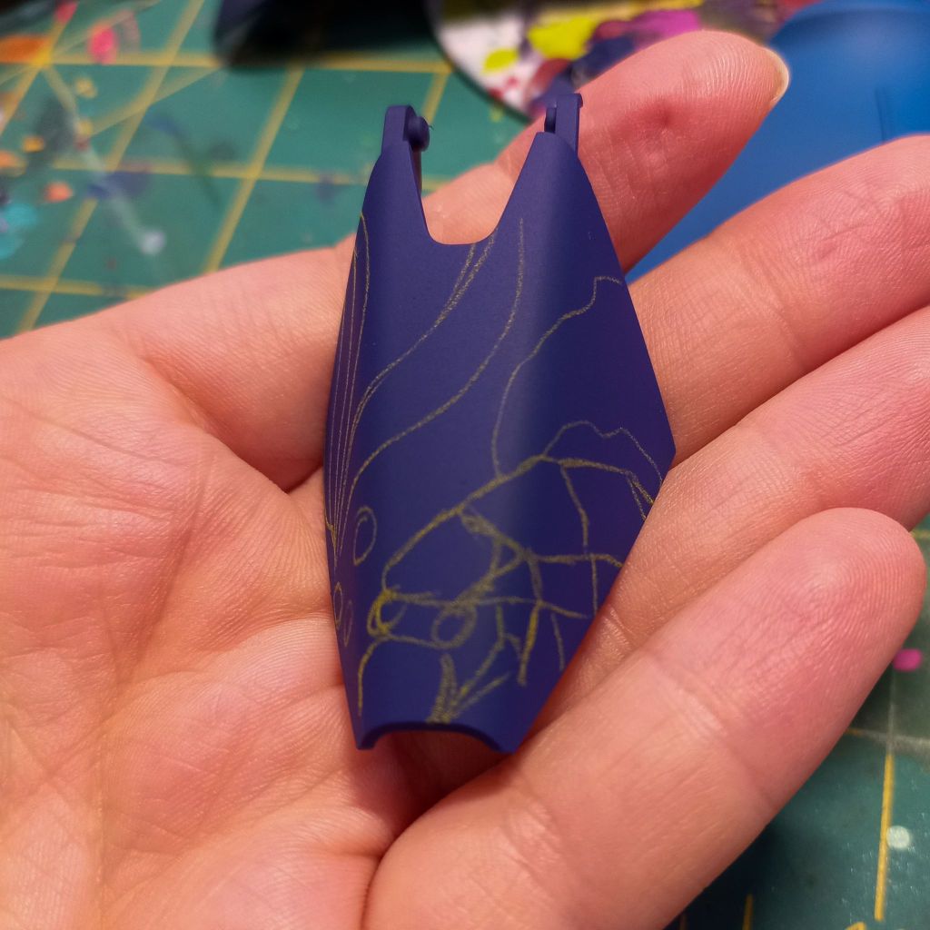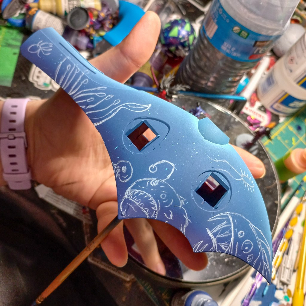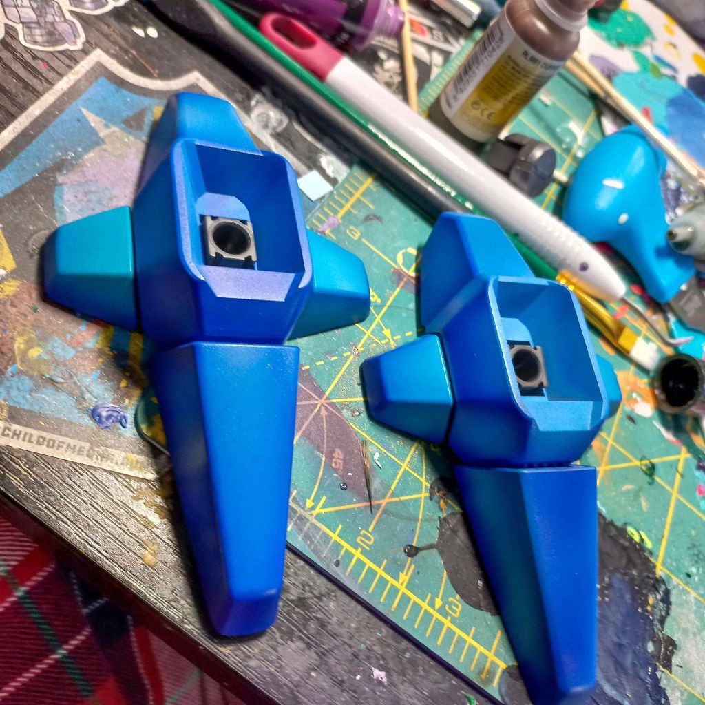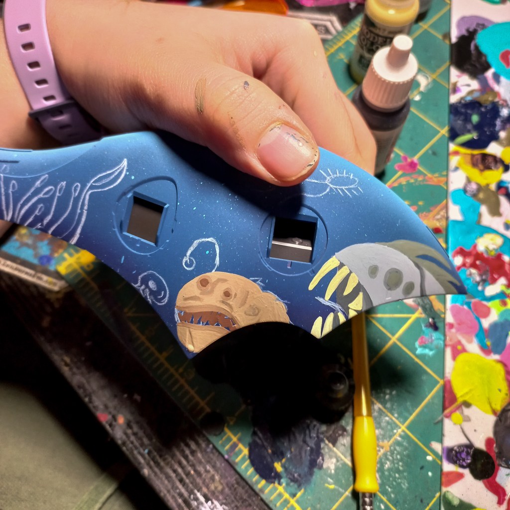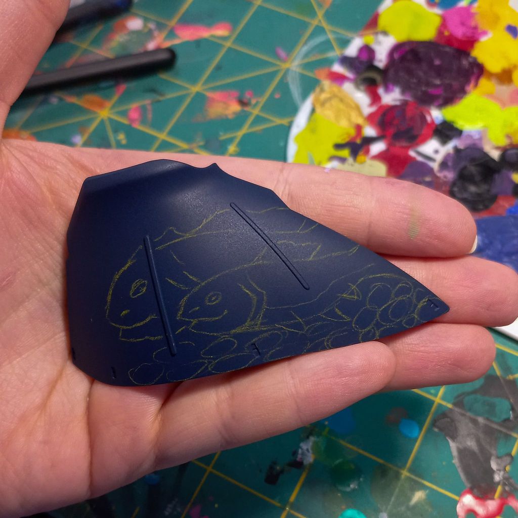 I painted sea ray creatures on it. The funnels are a bright yellow (as a contrast color) and the thrusters are a base black. I chose a flat olive drab for the inner frame. It felt the best choice to compliment the blues.