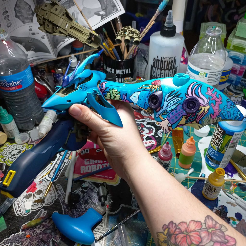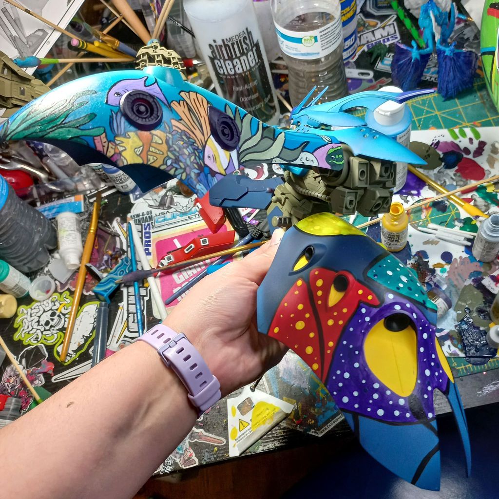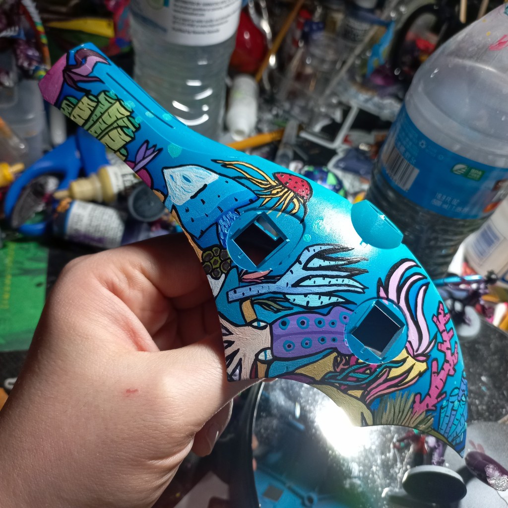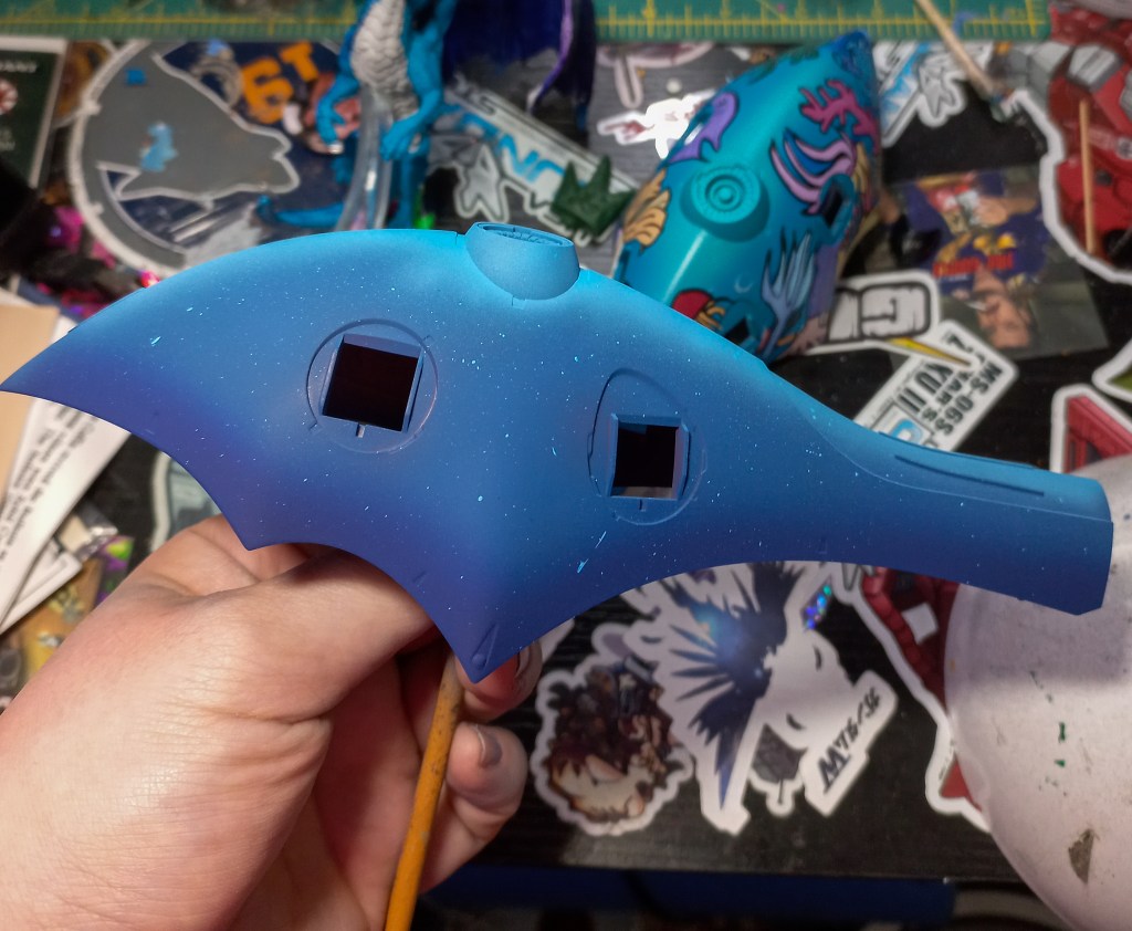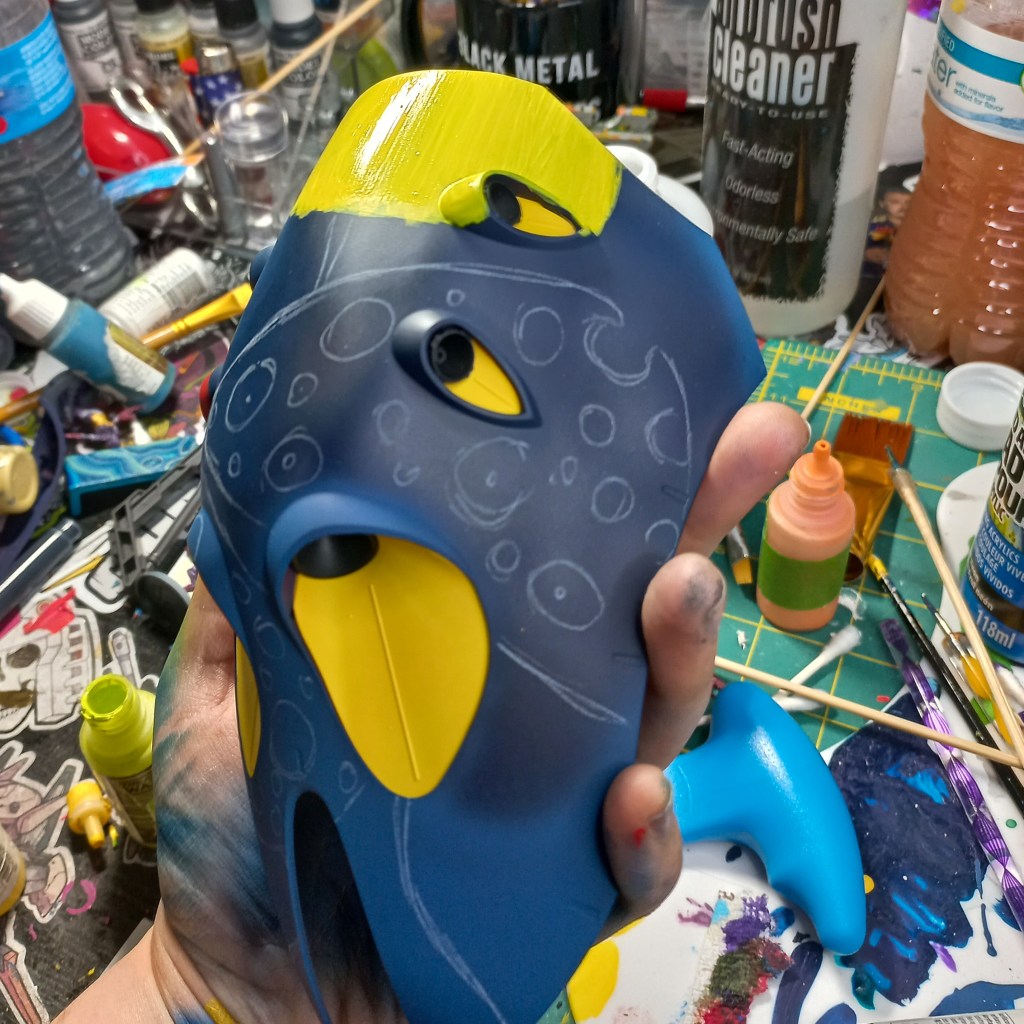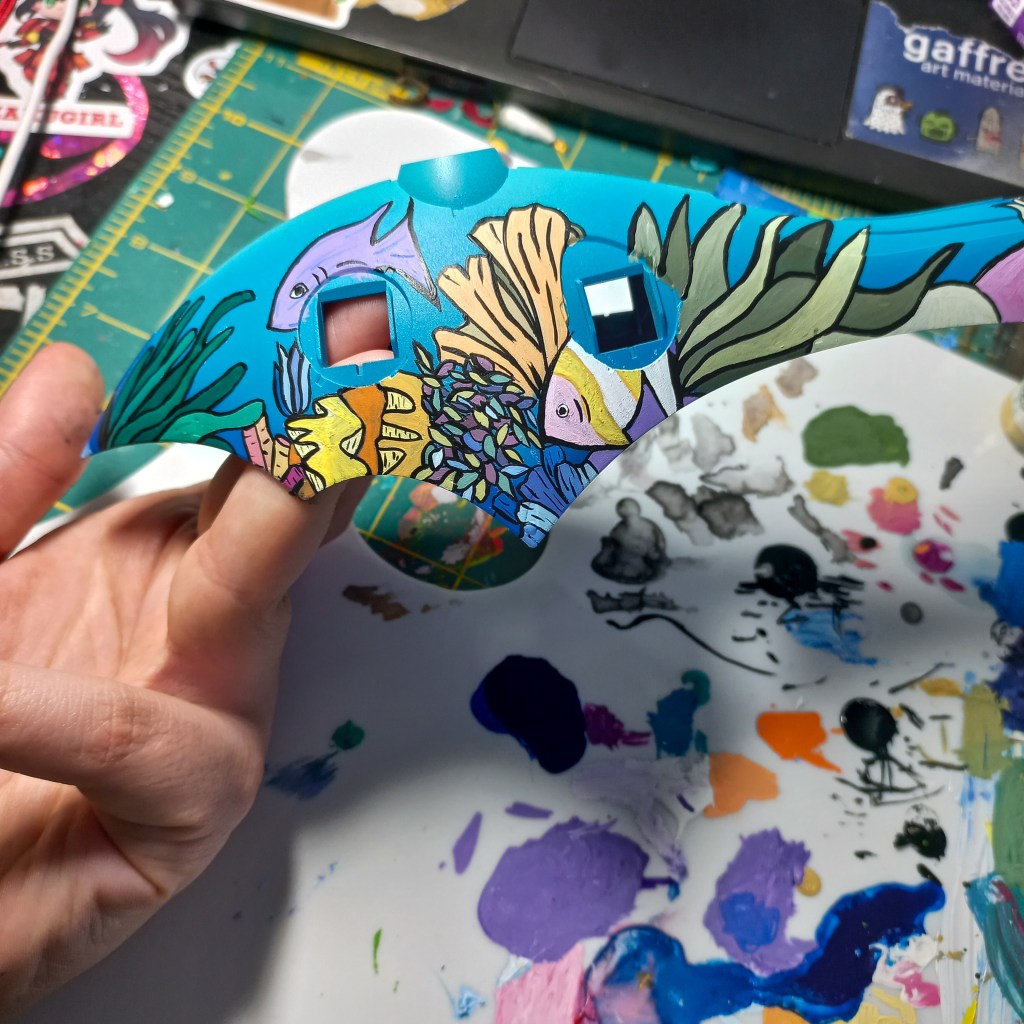 I painted sea ray creatures on it. The funnels are a bright yellow (as a contrast color) and the thrusters are a base black. I chose a flat olive drab for the inner frame. It felt the best choice to compliment the blues.