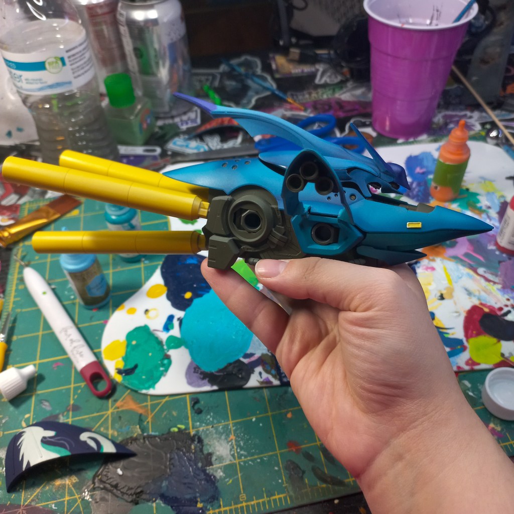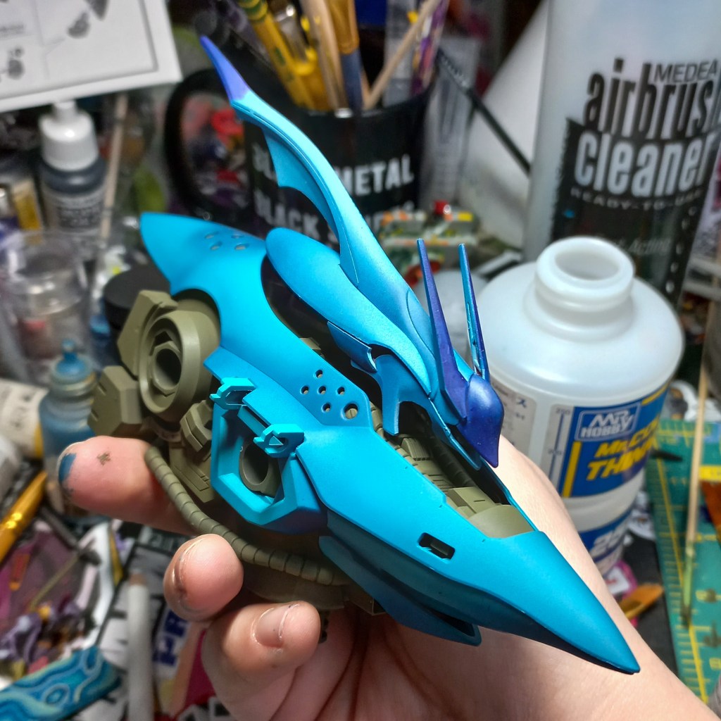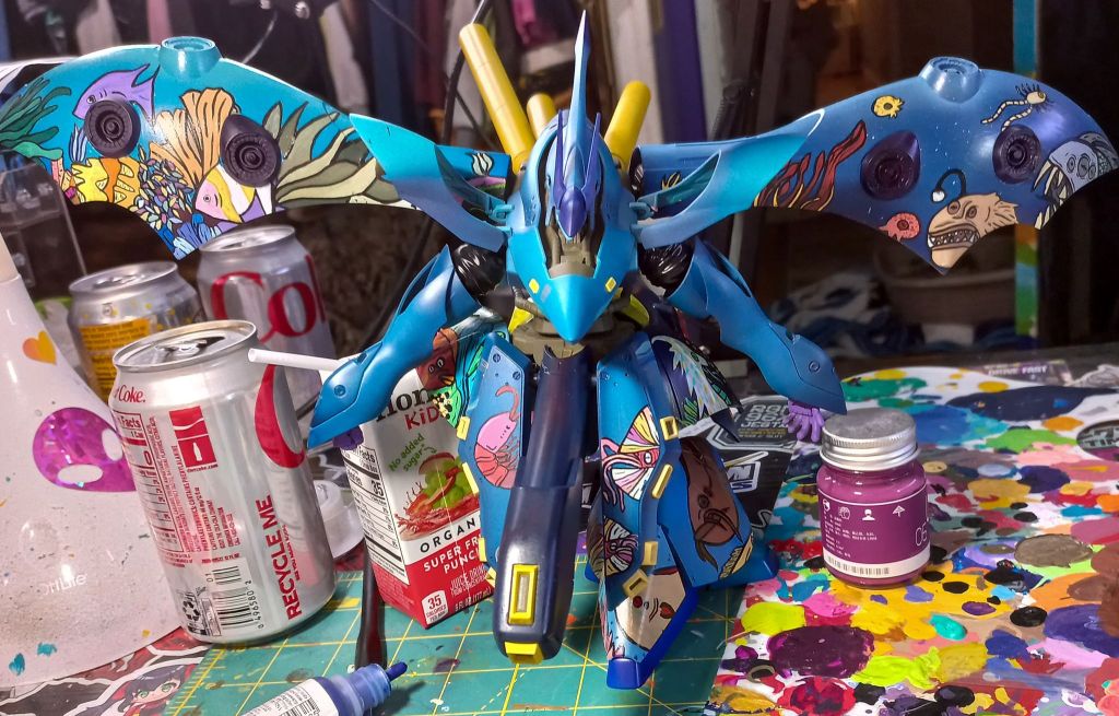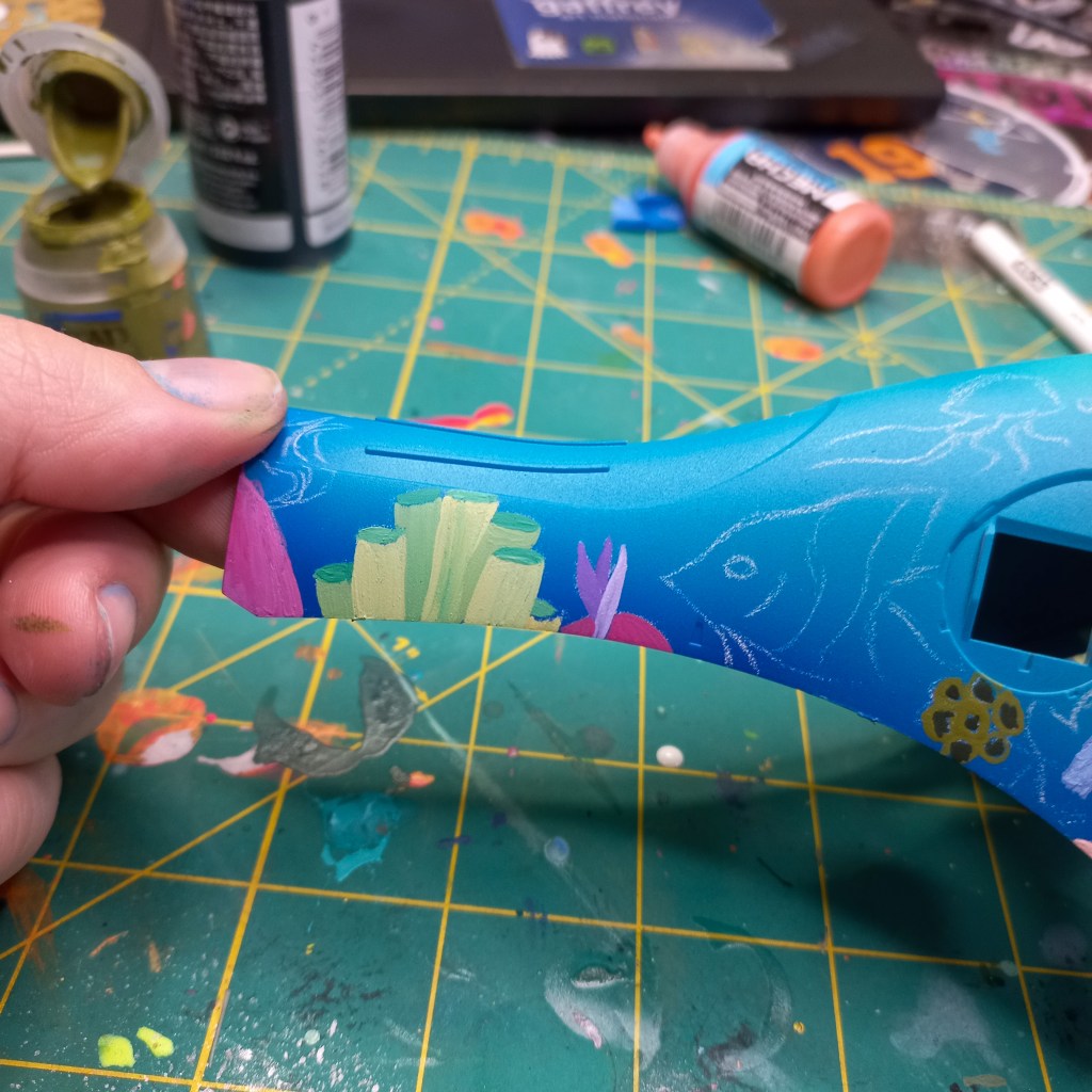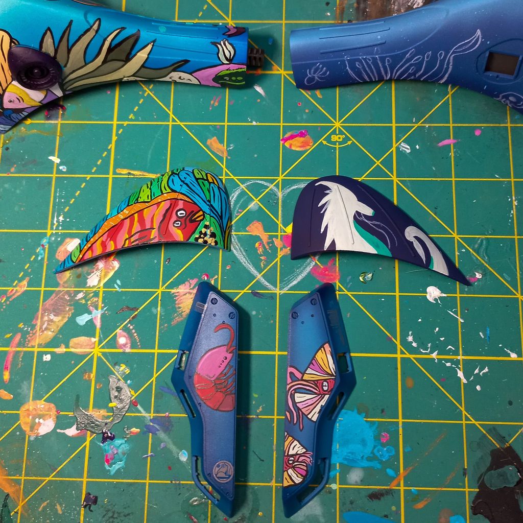 I painted sea ray creatures on it. The funnels are a bright yellow (as a contrast color) and the thrusters are a base black. I chose a flat olive drab for the inner frame. It felt the best choice to compliment the blues.