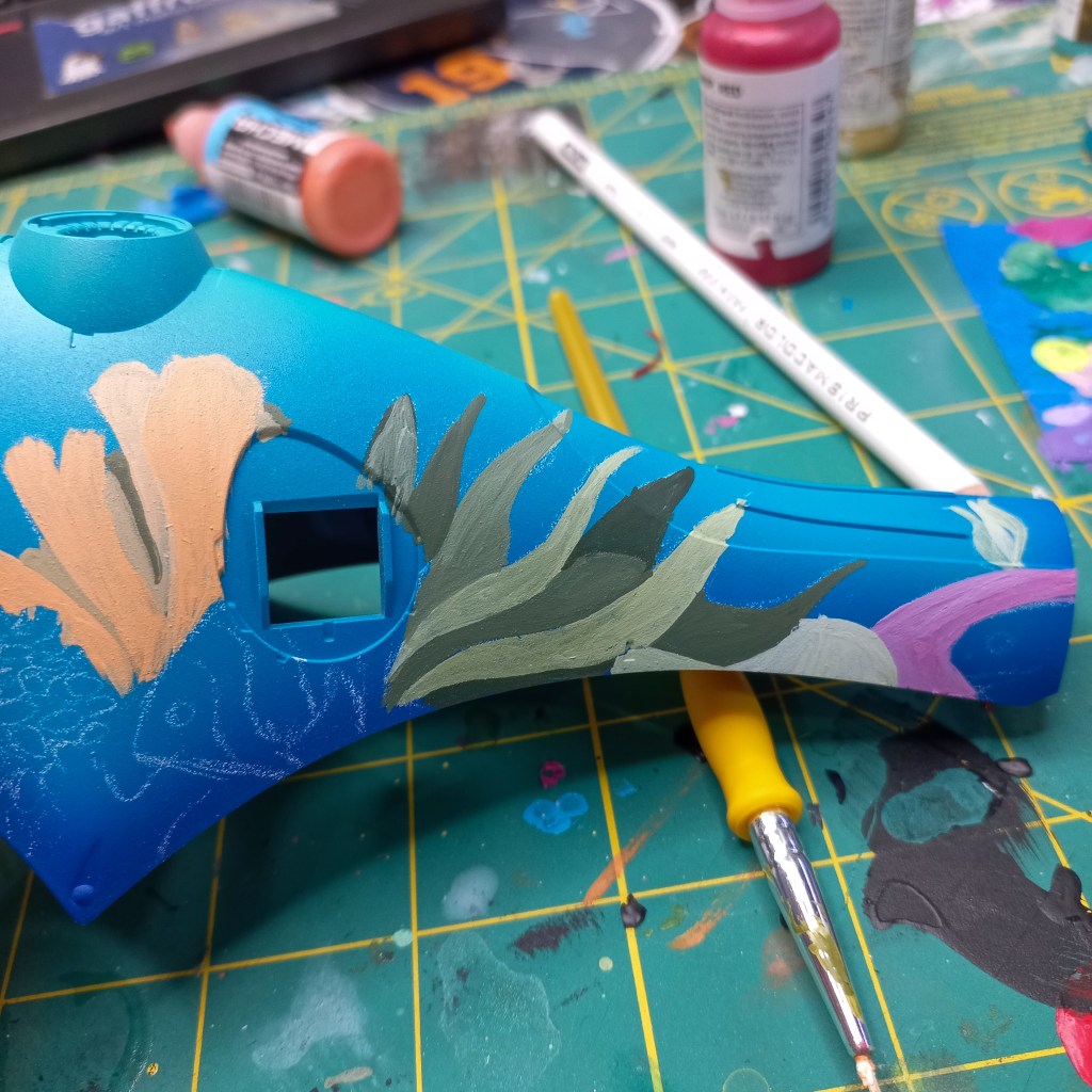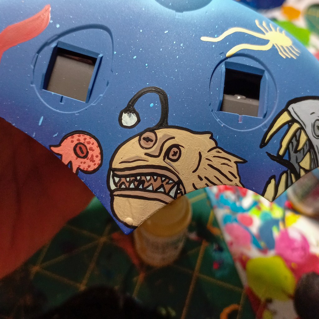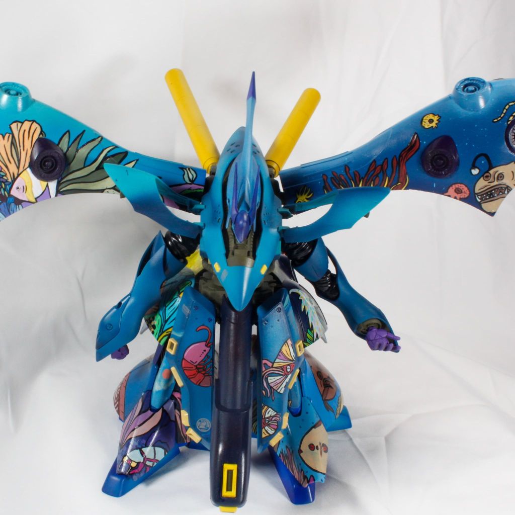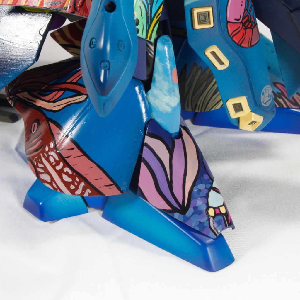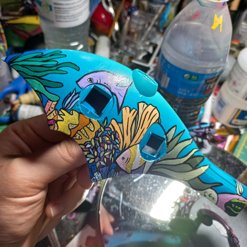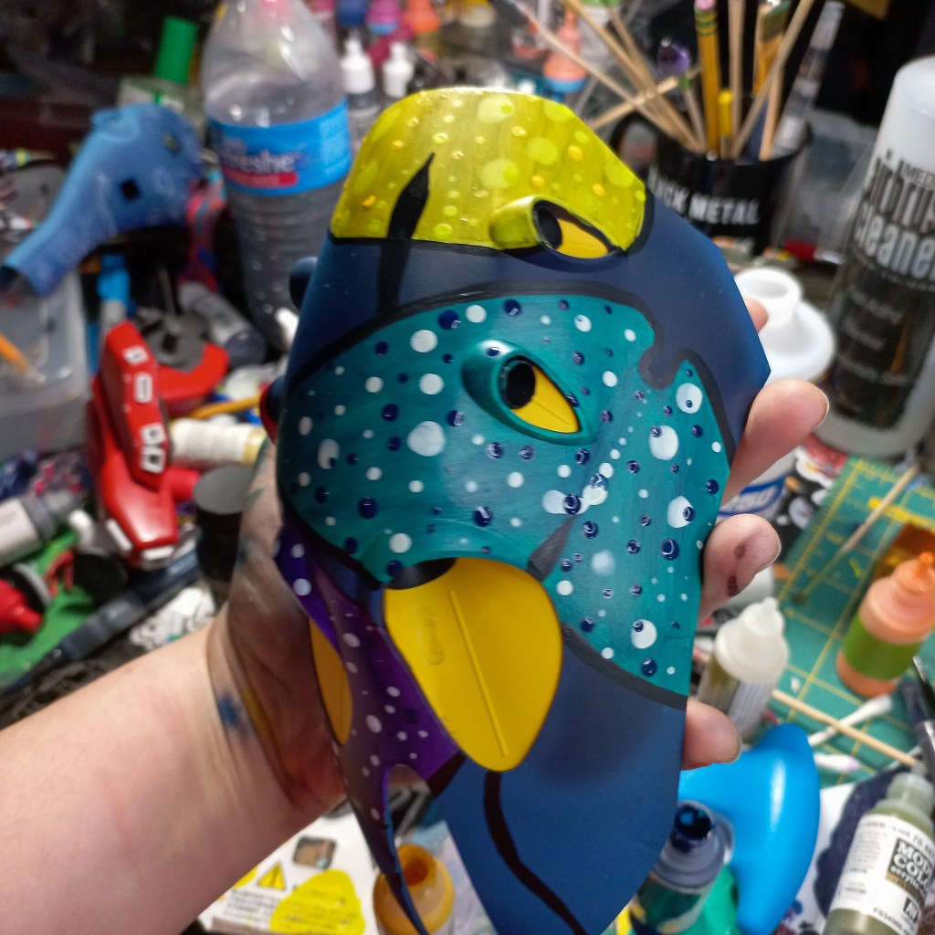 I painted sea ray creatures on it. The funnels are a bright yellow (as a contrast color) and the thrusters are a base black. I chose a flat olive drab for the inner frame. It felt the best choice to compliment the blues.