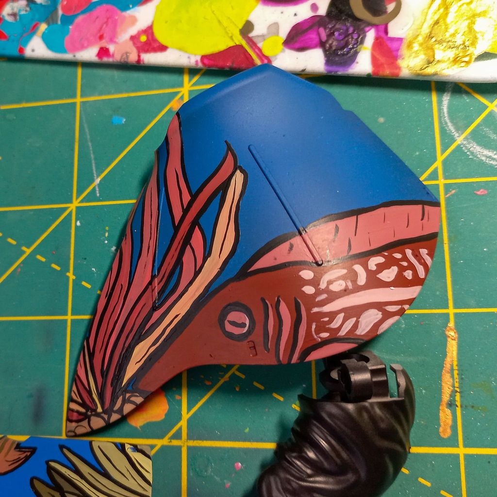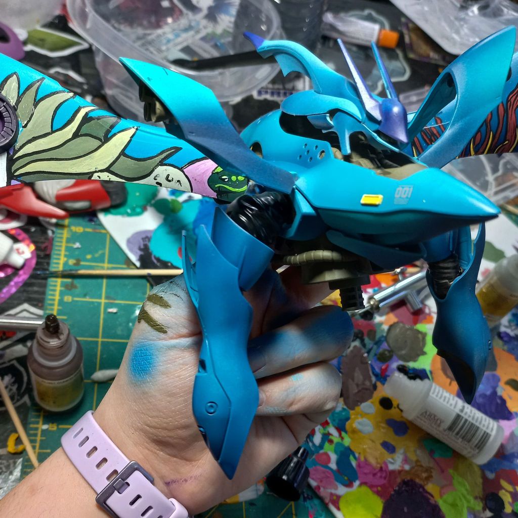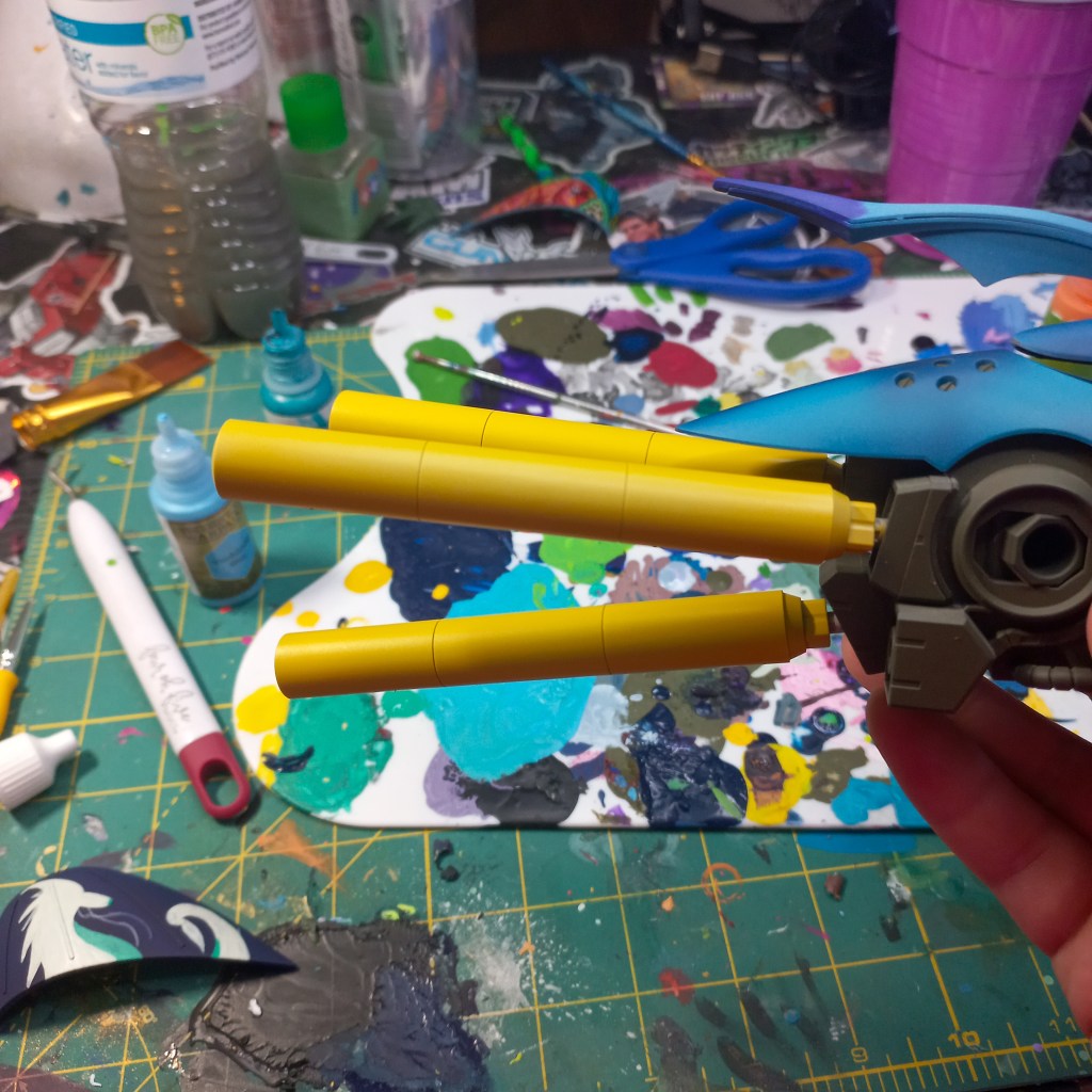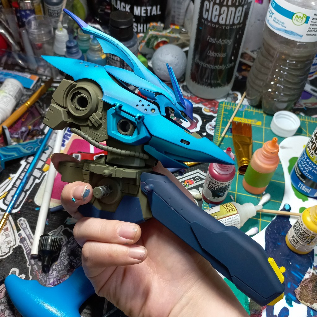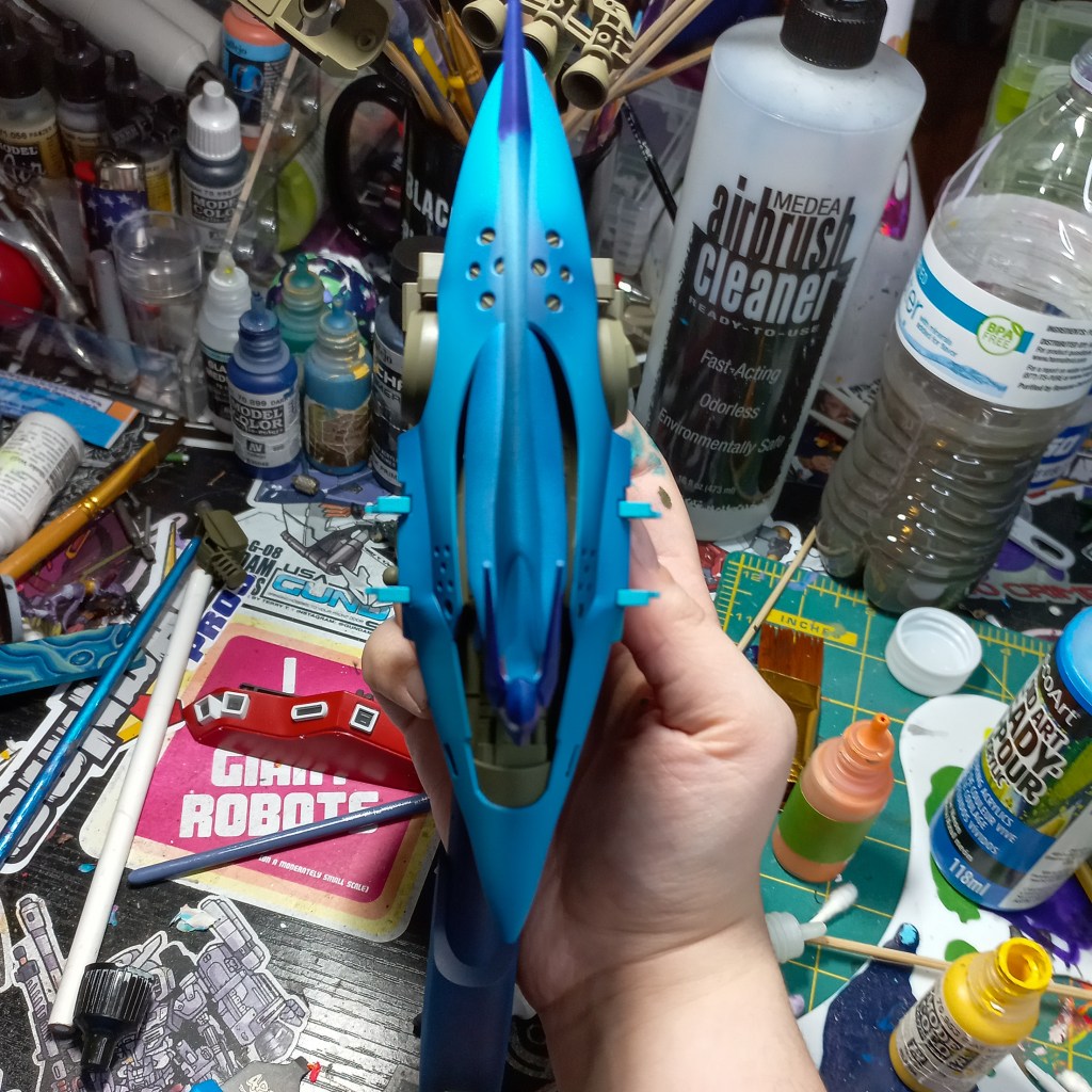 I painted sea ray creatures on it. The funnels are a bright yellow (as a contrast color) and the thrusters are a base black. I chose a flat olive drab for the inner frame. It felt the best choice to compliment the blues.