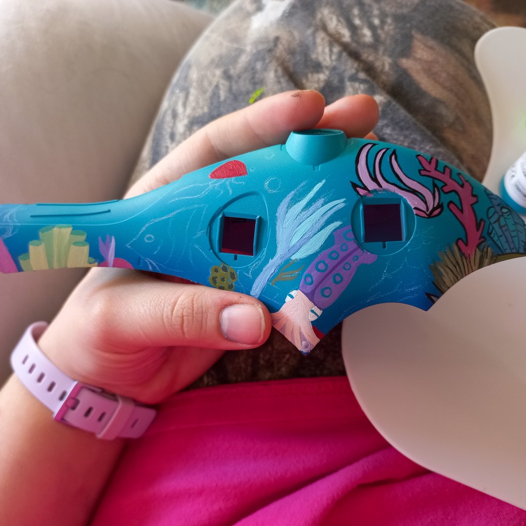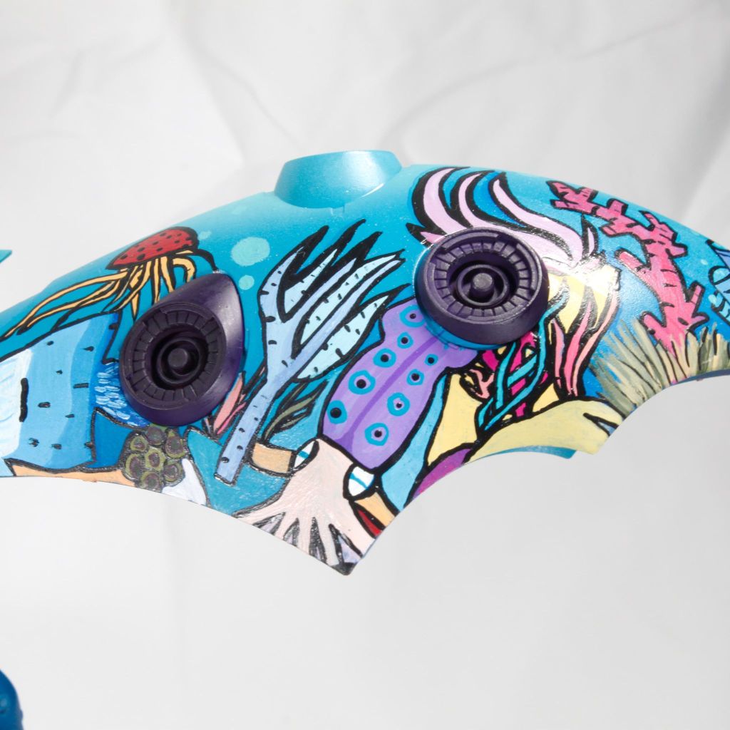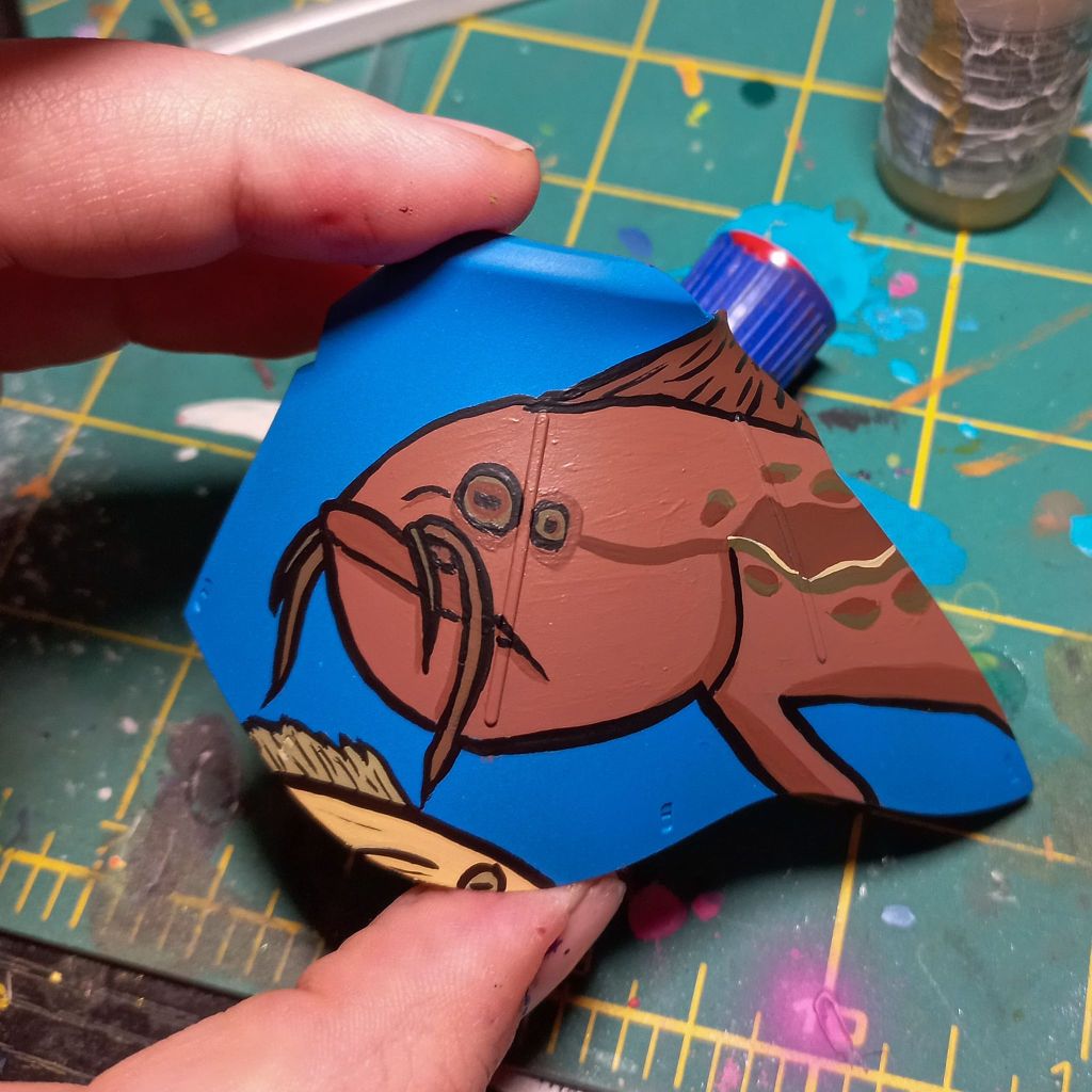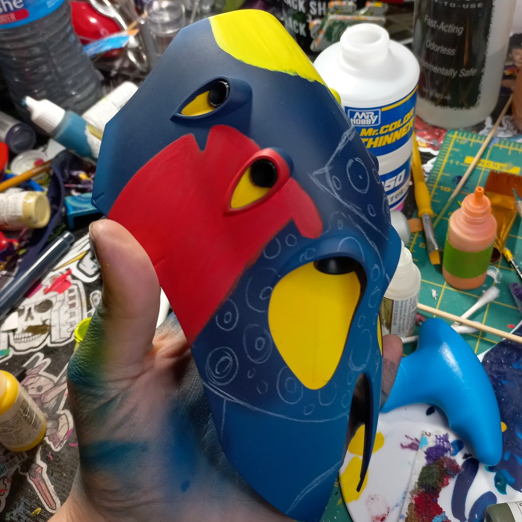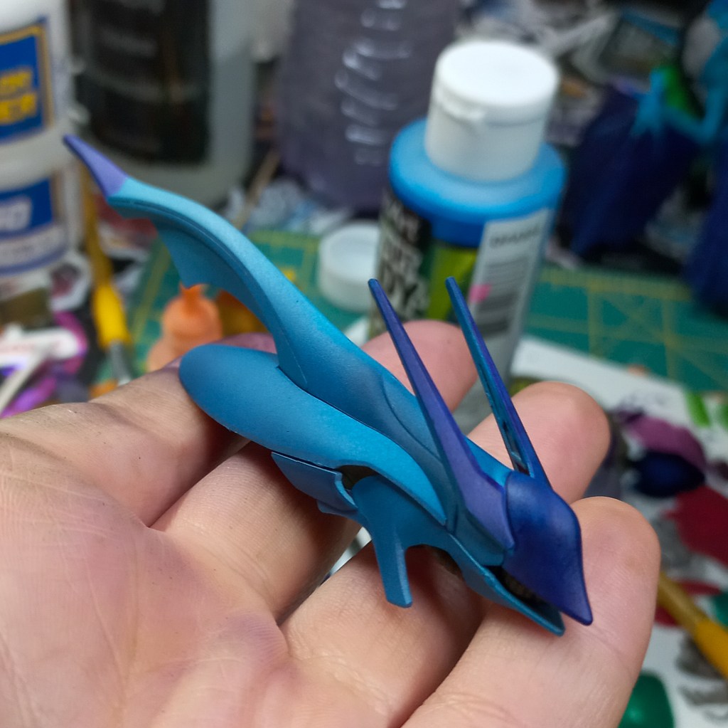 I painted sea ray creatures on it. The funnels are a bright yellow (as a contrast color) and the thrusters are a base black. I chose a flat olive drab for the inner frame. It felt the best choice to compliment the blues.