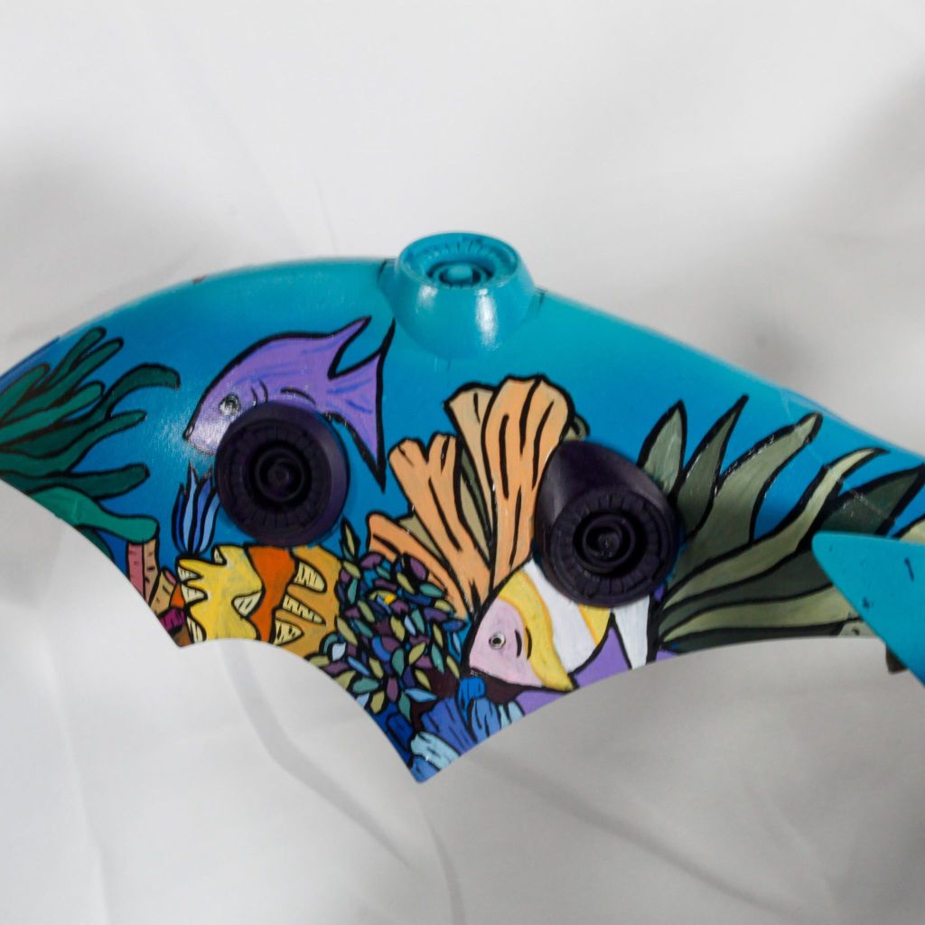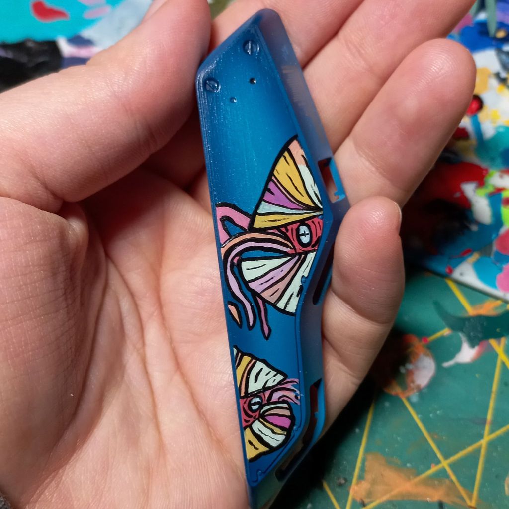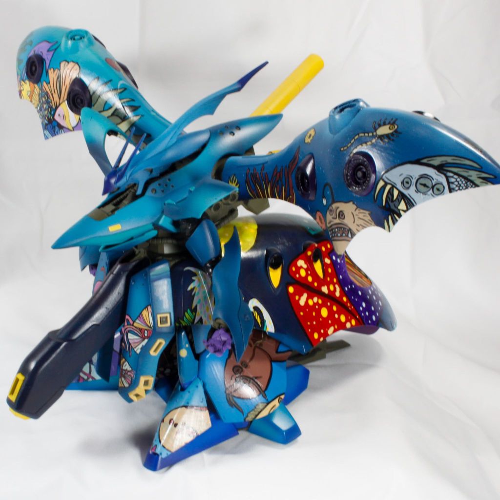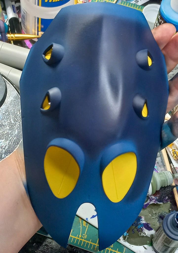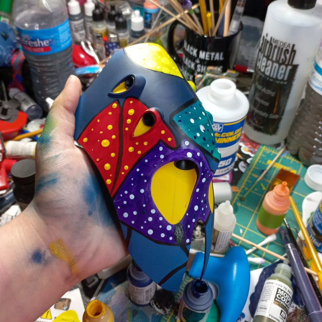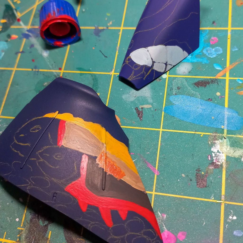 I painted sea ray creatures on it. The funnels are a bright yellow (as a contrast color) and the thrusters are a base black. I chose a flat olive drab for the inner frame. It felt the best choice to compliment the blues.