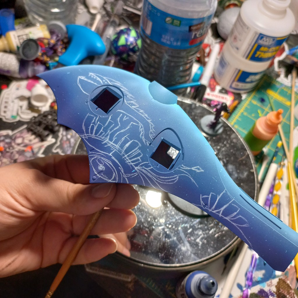 The first parts I started to both spraypaint and handprint were the shoulders. These really set the story tone for the build. I did a base blue then did a darker blue fade. I topped each off with a highlight of a lighter blue. Each shoulder took about 5 hours (layer drying time included) to fully handprint.