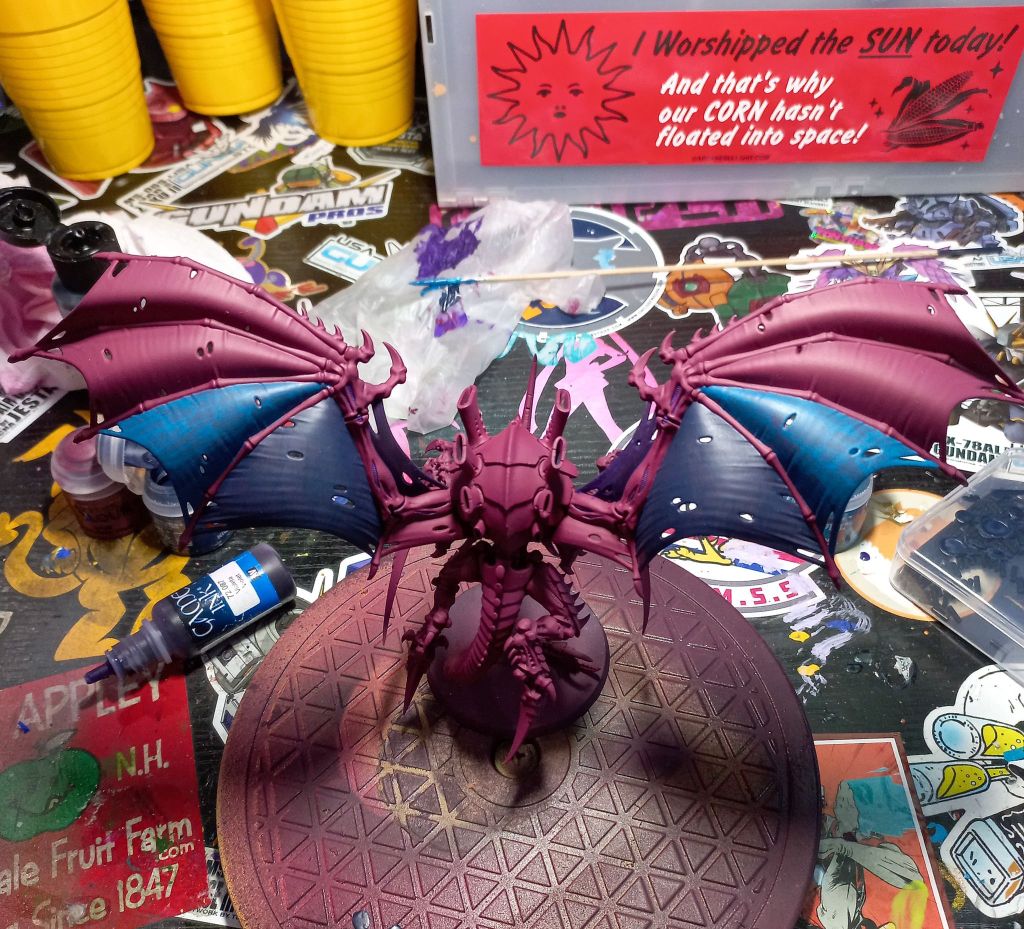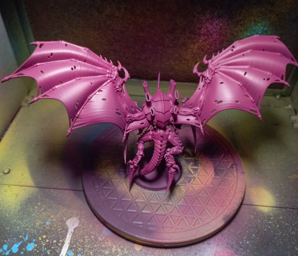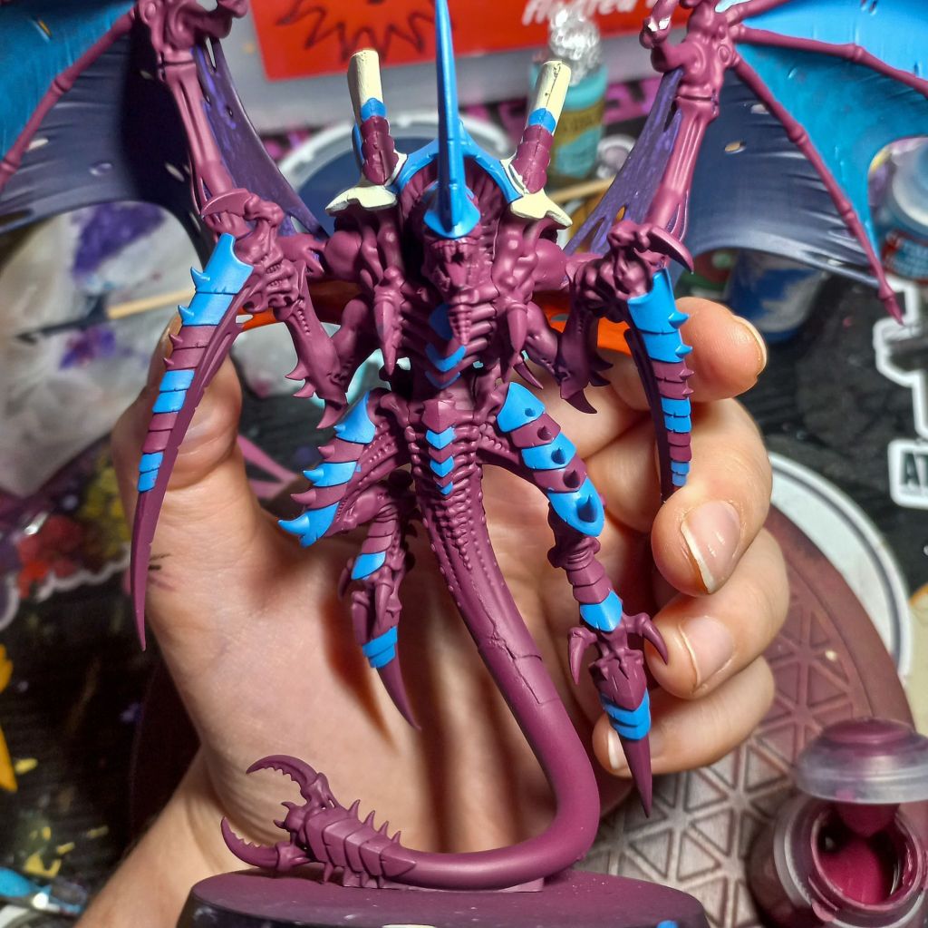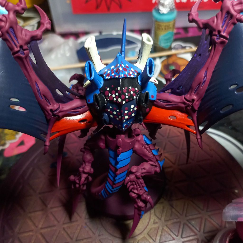 So I finally started to repaint my Hive Tyrant after stripping off the old paint job. I decided to go with a darker pink with several blue shades and some highlights of red and yellow.