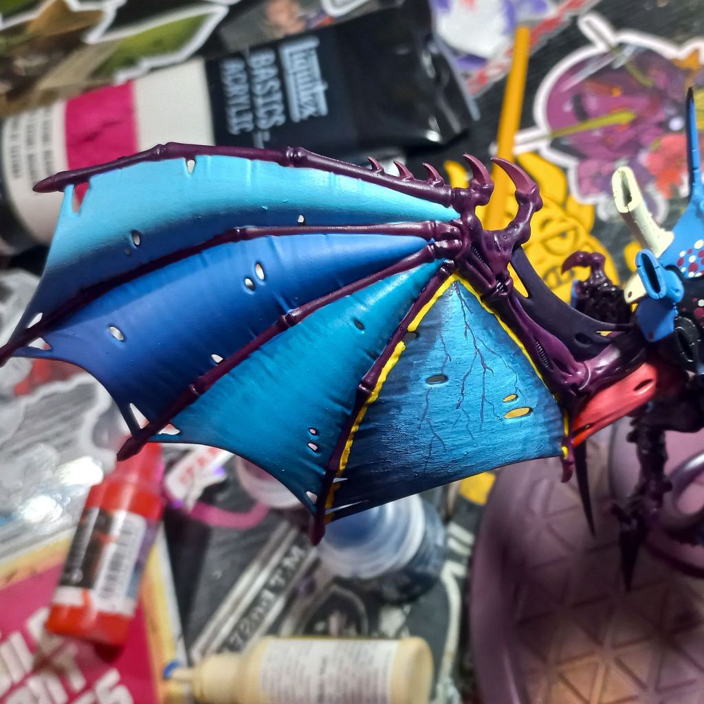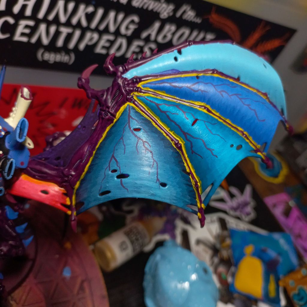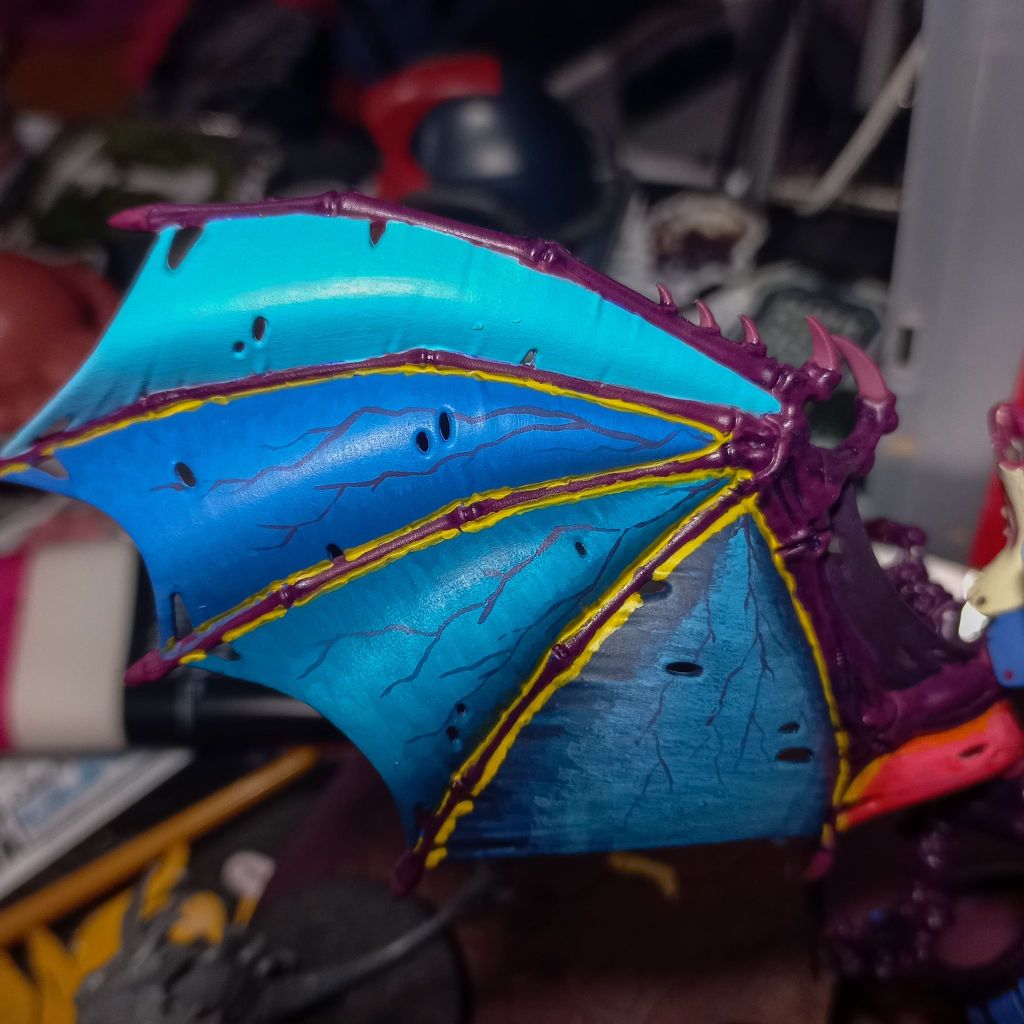 I’ve never blended on a mini before and it’s quite different from gunpla, so I’m a little out of my zone. I’ve been following this tutorial. The first wing blend attempt was rough but I think I’m starting to slowly improve on it. Highlighting the edge of the wing membrane is turning out rougher than expected. I like the method but it’s a fun challenge for me to overcome in the future.