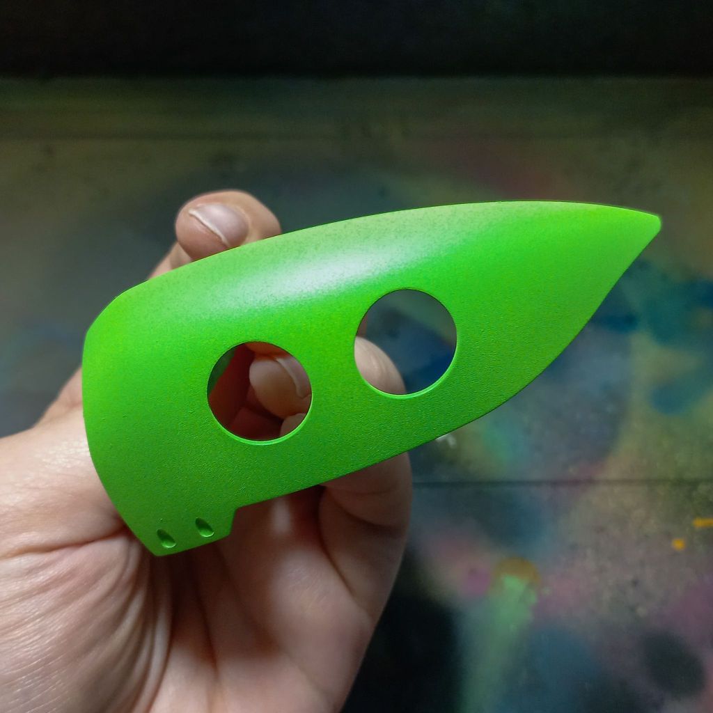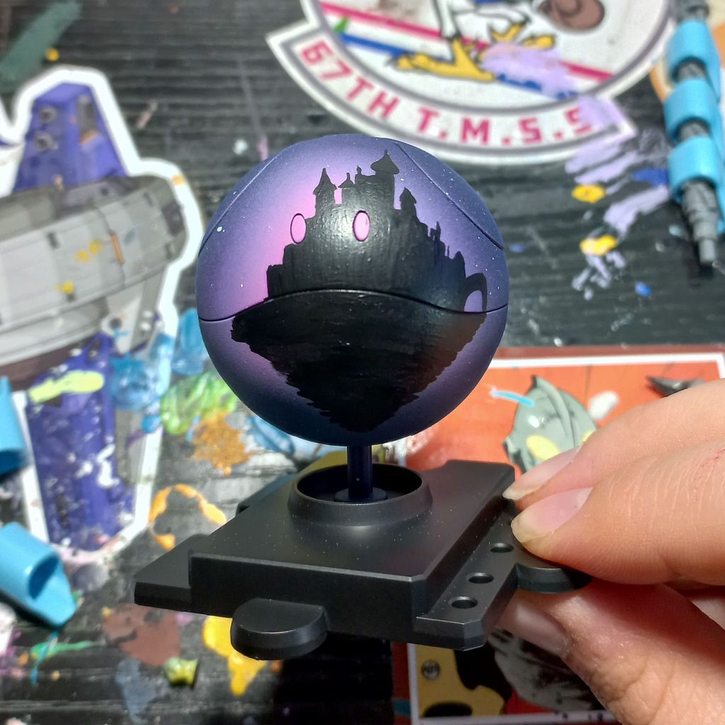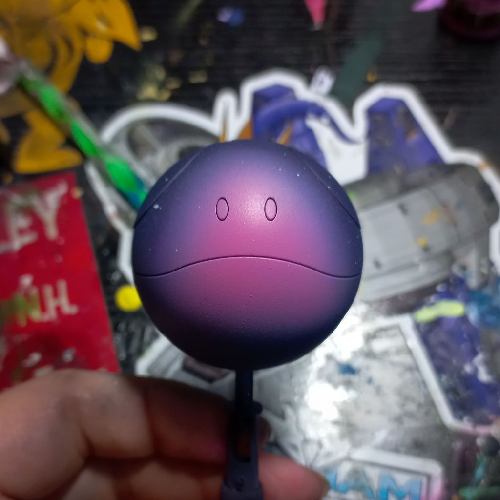 I prepped the haro and did a super deep clean of my airbrush (removing any room for error). I then did a layer of black primer, and dark Prussian blue mixed with a black primer (a 3:1 ratio) layer. After letting that cure I sprayed a layer of purple ink on the haros front face and once that was dried I applied a quick blast of pink.