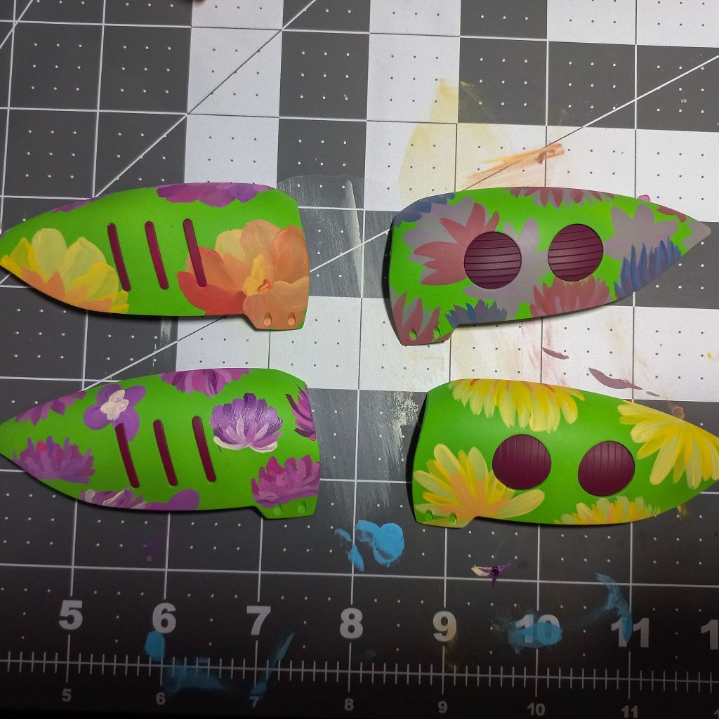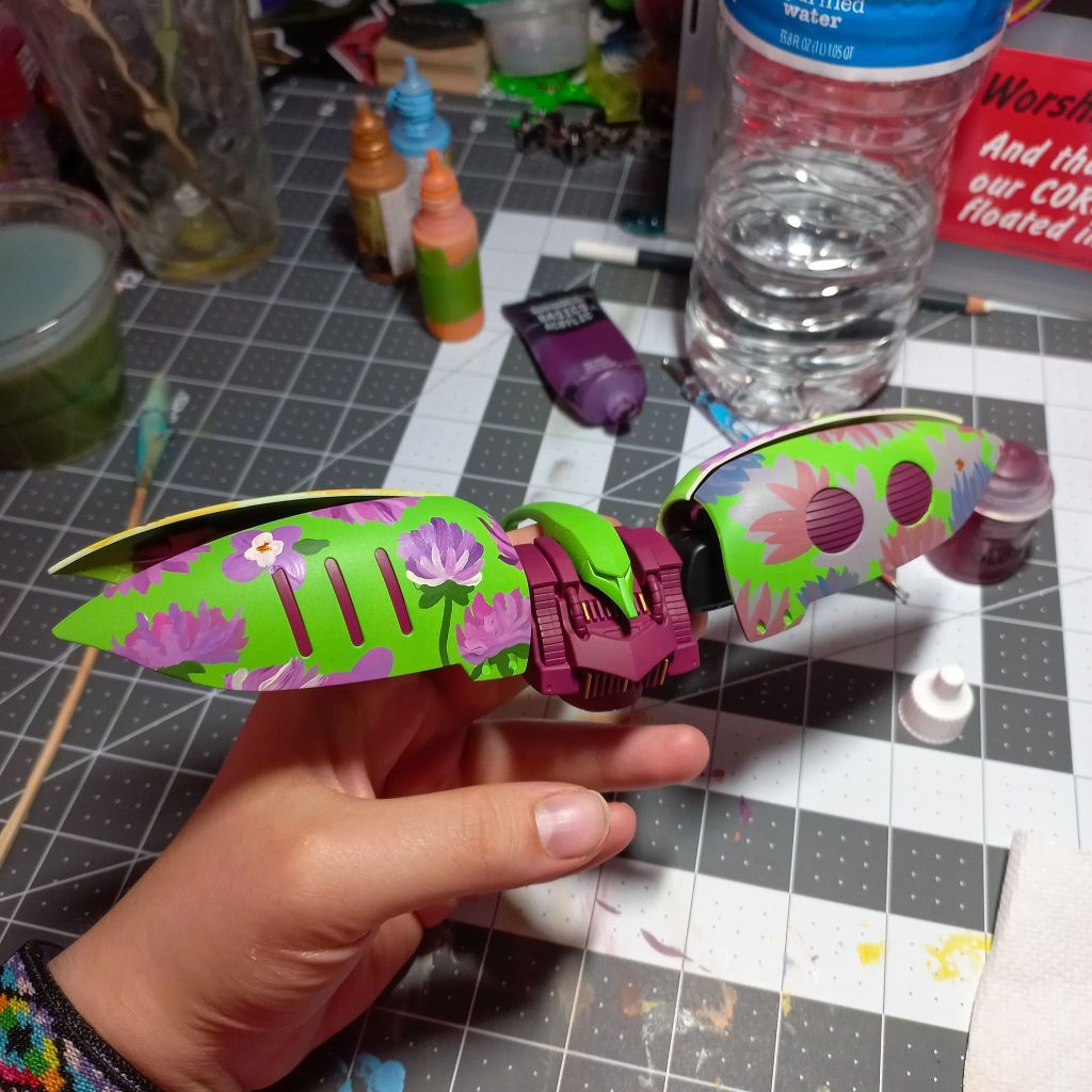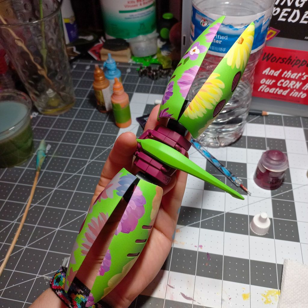 The flowers are currently being hand painted with a blend of Citadel, Liquitex, and other acrylic paints.