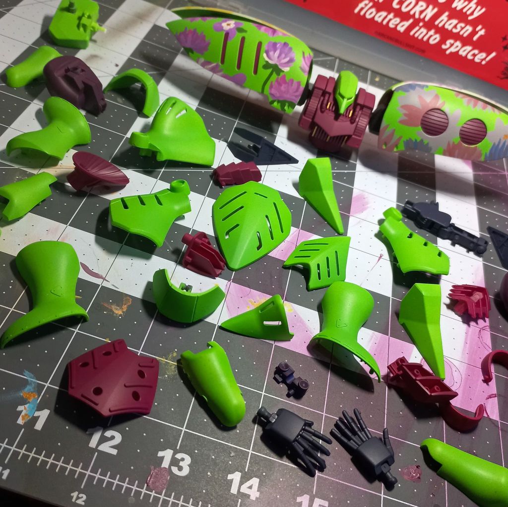 The white parts of the Qube were done in a vibrant green. The green was Snake Scale green by Army Painter Warpaint. It actually came out brighter than I thought it would. The dark pink was done in Screamer pink by Citadel. Before detailing I did a quick layer of satin varnish.