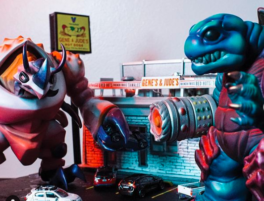 Sofub is a lot harder to give personality to. Some of these characters donβt have a background. Itβs hard for me to give sofubi a narrative. Thatβs why I did the hot dog diorama for the cerulean project, where the monsters were fighting in a parking lot.