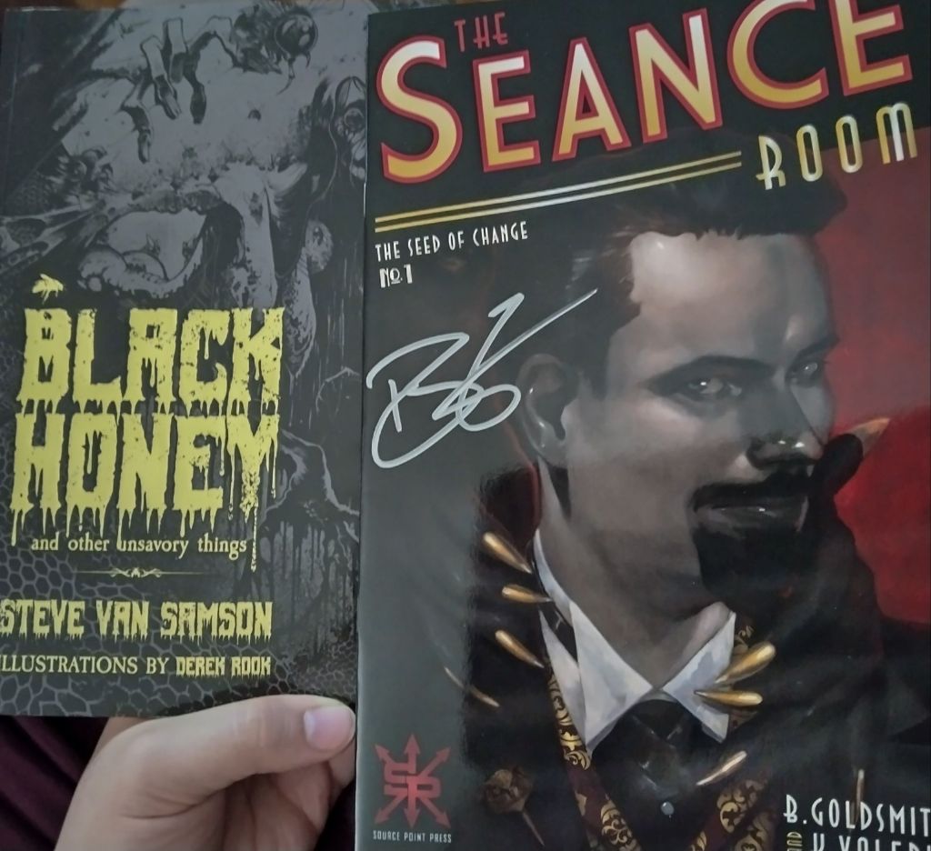 I got to meet Ben Goldsmith and get an autograph on the first issue of โThe Seance Roomโ. The other book I got was โBlack Honeyโ by Steve Van Samson. It’s a horror short story complication.