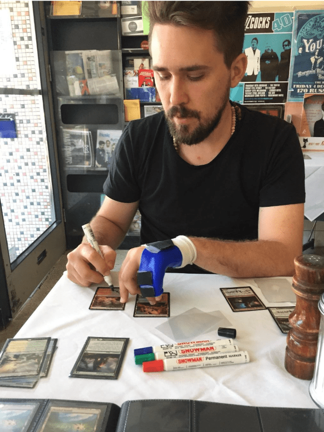 Adam Paquette is my favorite artist! I am in love with how he draws lands. I met him randomly at a coffee shop in Melbourne, and he drew on my trade’s folder for free! That folder is now my designated “Lands Folder”. At that time, he injured his left hand. But he managed to still sign my cards also.