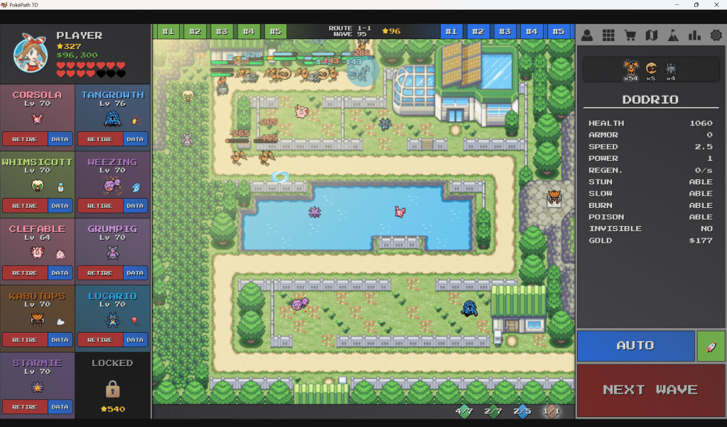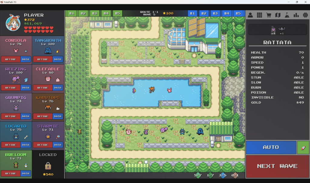 PokéPath TD is a single-player tower defense game made by Khydra98 on Itch.io. Navigate the team-building aspect of PokéPath while you fight wave after wave of enemies. There are nine routes to play through. Each has a hundred waves of enemies. The final wave features a legendary Pokémon.